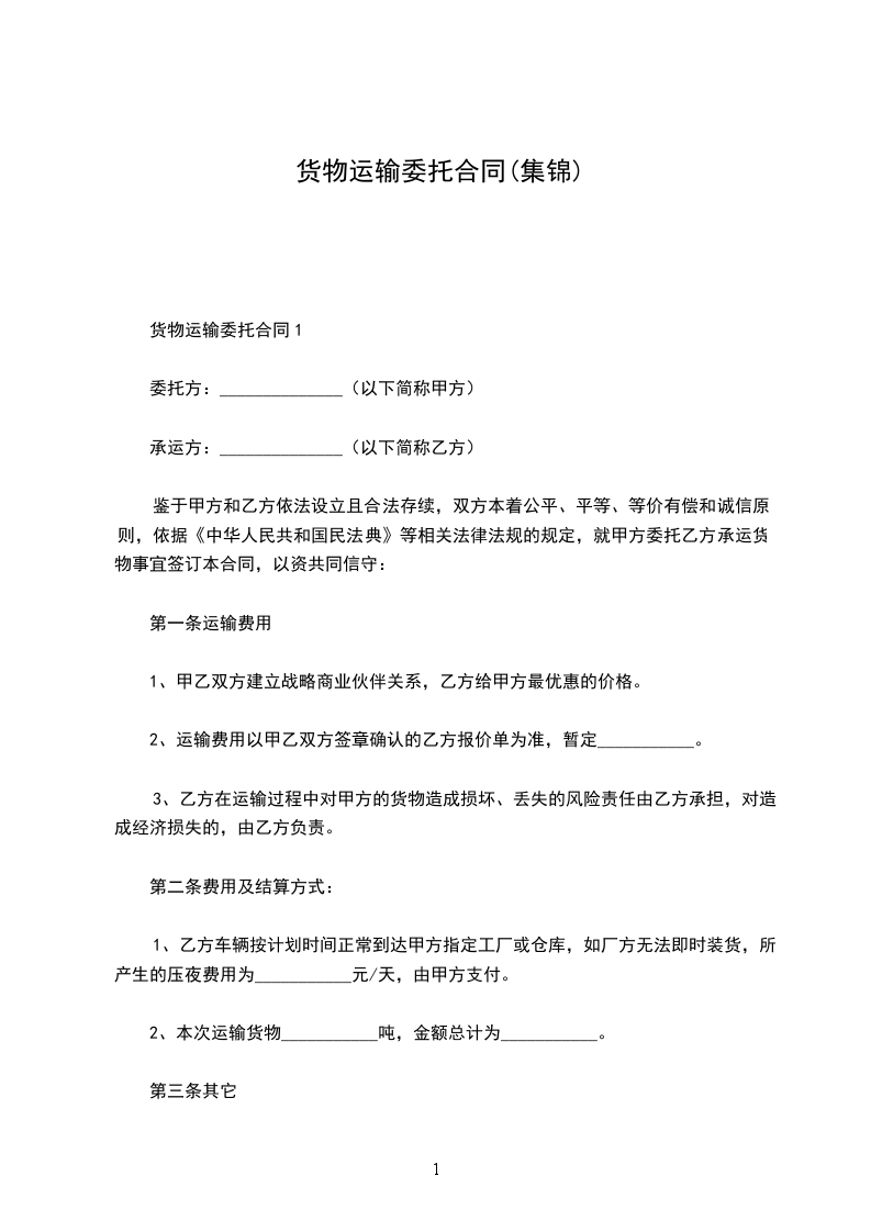 鉴于甲方和乙方依法设立且合法存续,双方本着公平、平等、等价有偿和诚信原则,依据《中华人民共和国民法典》等相关法律法规的规定,就甲方委托乙方承运货物事宜签订本合同,以资共同信守: