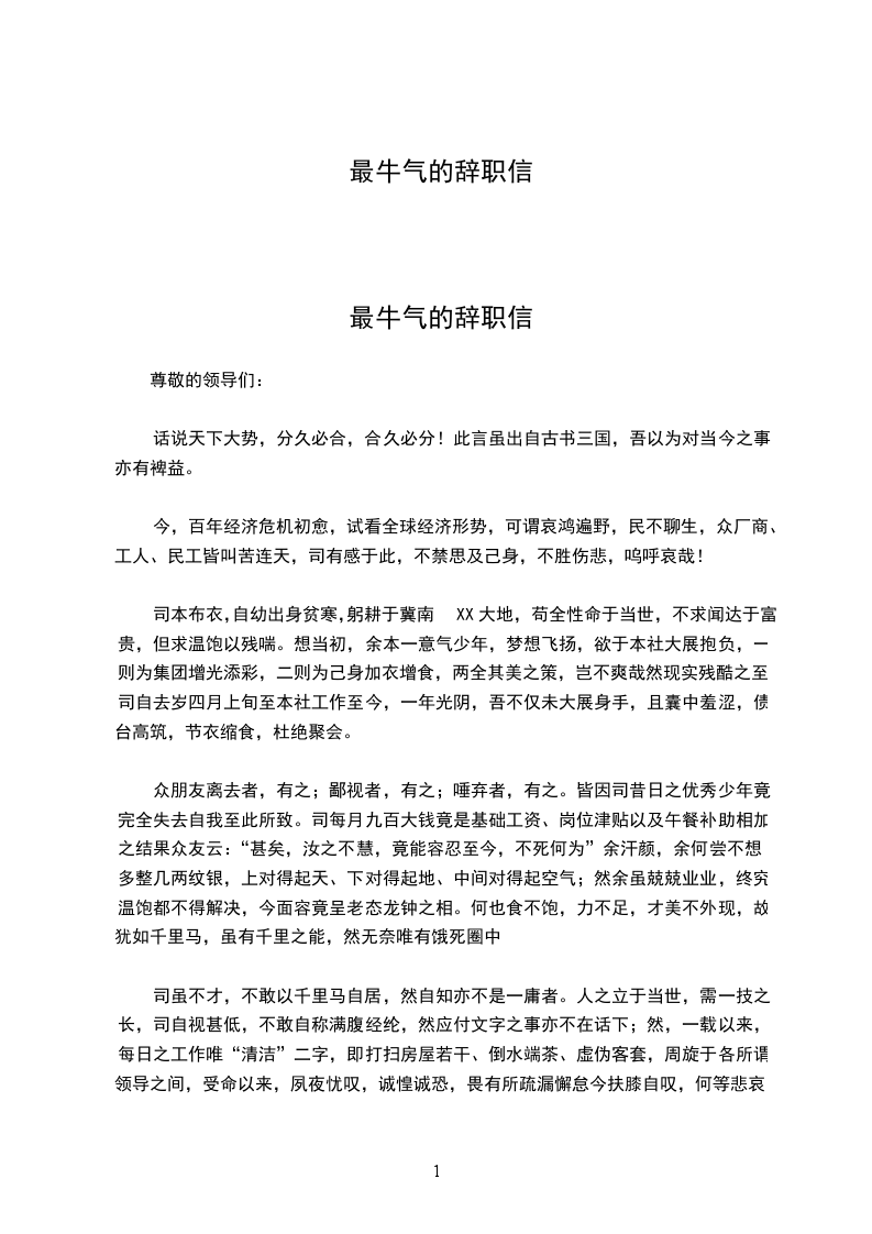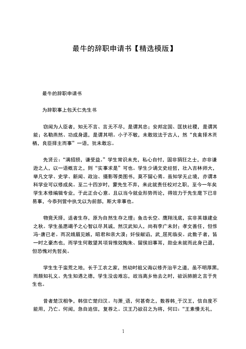 昔者楚汉相争,韩信亡楚归汉。与萧何语,何甚奇之,数荐韩信于汉王,信自度不能用,乃亡。何闻,急自追信,复荐之。汉王乃欲召之为将,何曰:“王素慢无礼,今拜将如呼小儿耳,此信所以去也。”于是汉王斋戒、沐浴、筑坛,拜韩信为大将。卒有炎汉四百年江山社稷。为王者须以此为诫,为将者亦须以此为诫也。为大将者,须知军队战斗力之核心,不在新兵之多寡,不在装备之优劣,而在军中有相当数量之老兵,忠诚勇敢、富于经验,且须以理想号召之,以粮饷供给之,继之以指挥得当,始能无往不胜。先驱老兵解甲,再募新兵上阵,有不败之理乎此不特以精兵资敌,而亦使士众寒心矣。军队如此,企业亦然。君子绝交,尚不出恶语,而况予自请辞去之徒乎个中缘由,惟先生明察。非学生不愿效力于先生,实学生不能效力于先生也。