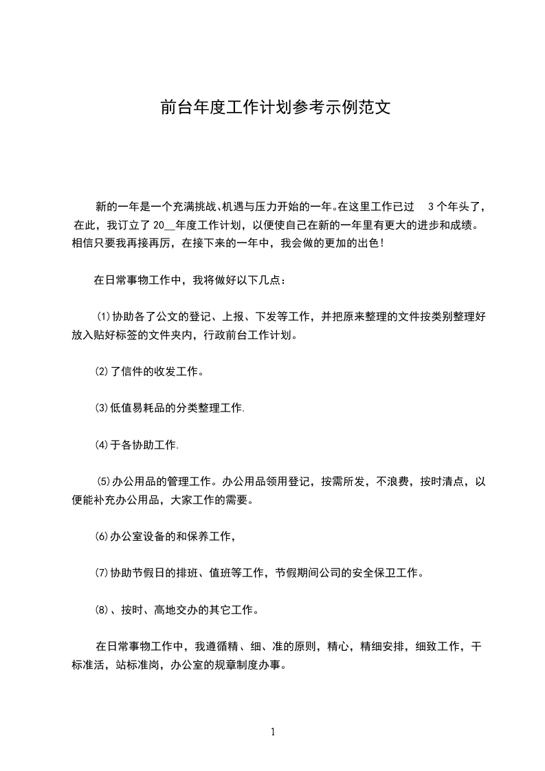新的一年是一个充满挑战、机遇与压力开始的一年。在这里工作已过3个年头了,在此,我订立了20__年度工作计划,以便使自己在新的一年里有更大的进步和成绩。相信只要我再接再厉,在接下来的一年中,我会做的更加的出色!