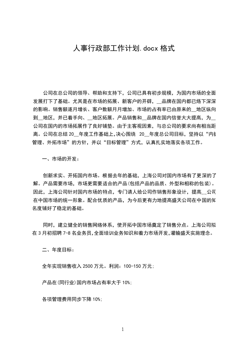 人事行政部工作计划为了确保公司的高速发展,为公司提供强有力的人力资源及后勤保障,人事行政部五月份工作目标是:认真学习,落实公司的经营的长远规划,以求真务实的态度,落实公司对人事行政部的人力资助人源及工后勤力工作的布置,统一思想,加强服务意识,做好本部门承担的工作。