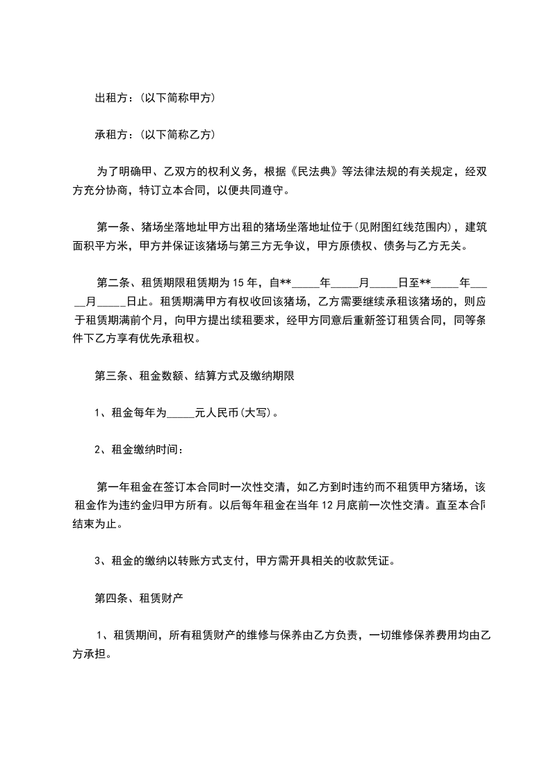 第一条、猪场坐落地址甲方出租的猪场坐落地址位于(见附图红线范围内),建筑面积平方米,甲方并保证该猪场与第三方无争议,甲方原债权、债务与乙方无关。