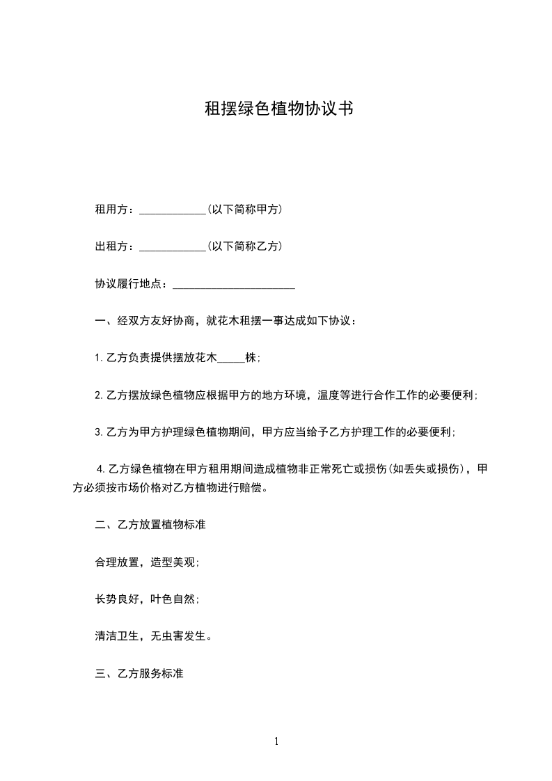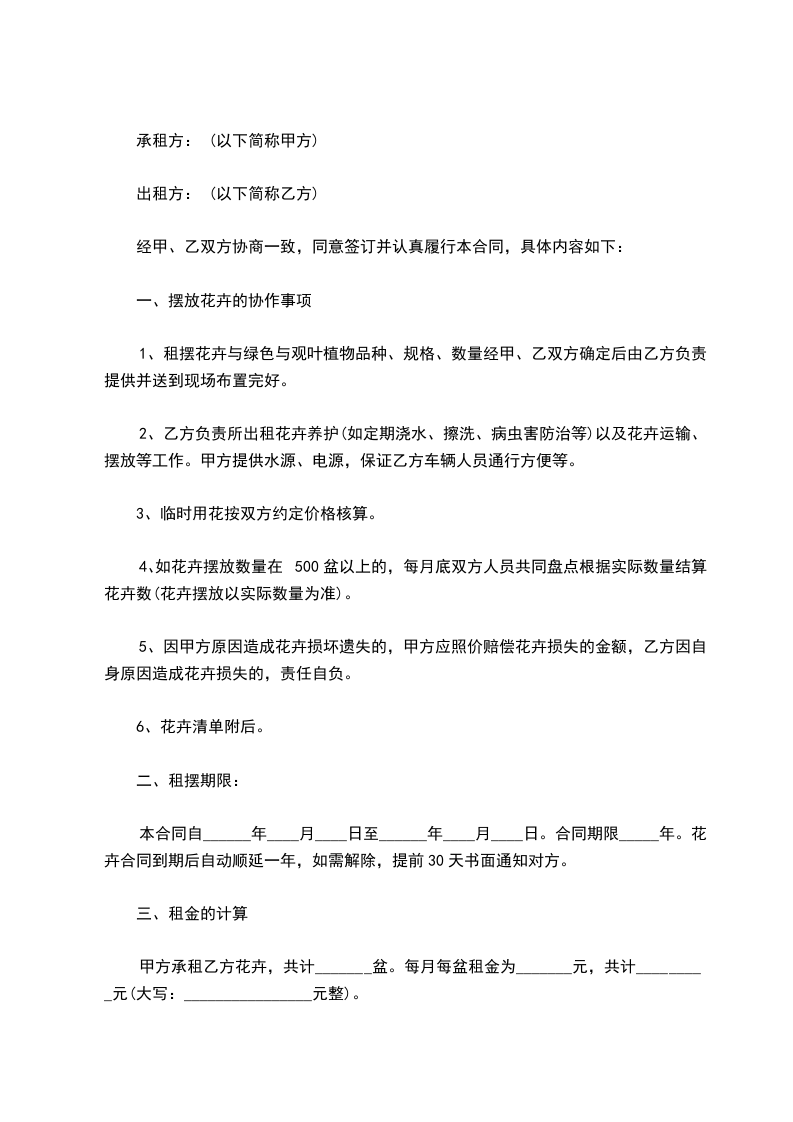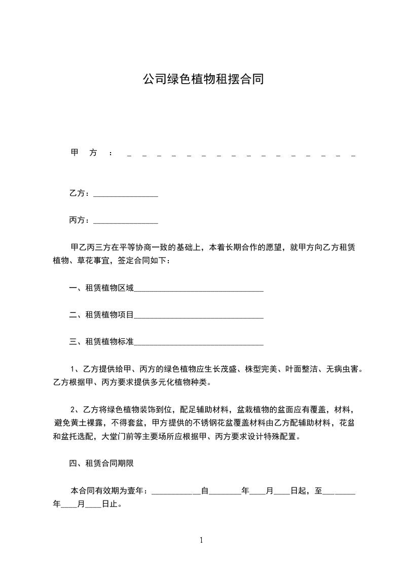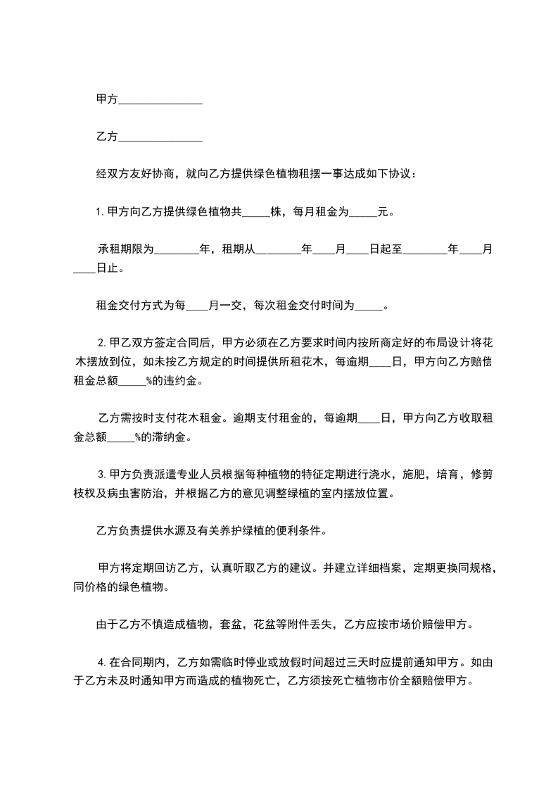 1.甲方向乙方提供绿色植物共_____株,每月租金为_____元。承租期限为_____年,租期从_____年_____月_____日起至_____年_____月_____日止。租金交付方式为每_____月一交,每次租金交付时间为_____。