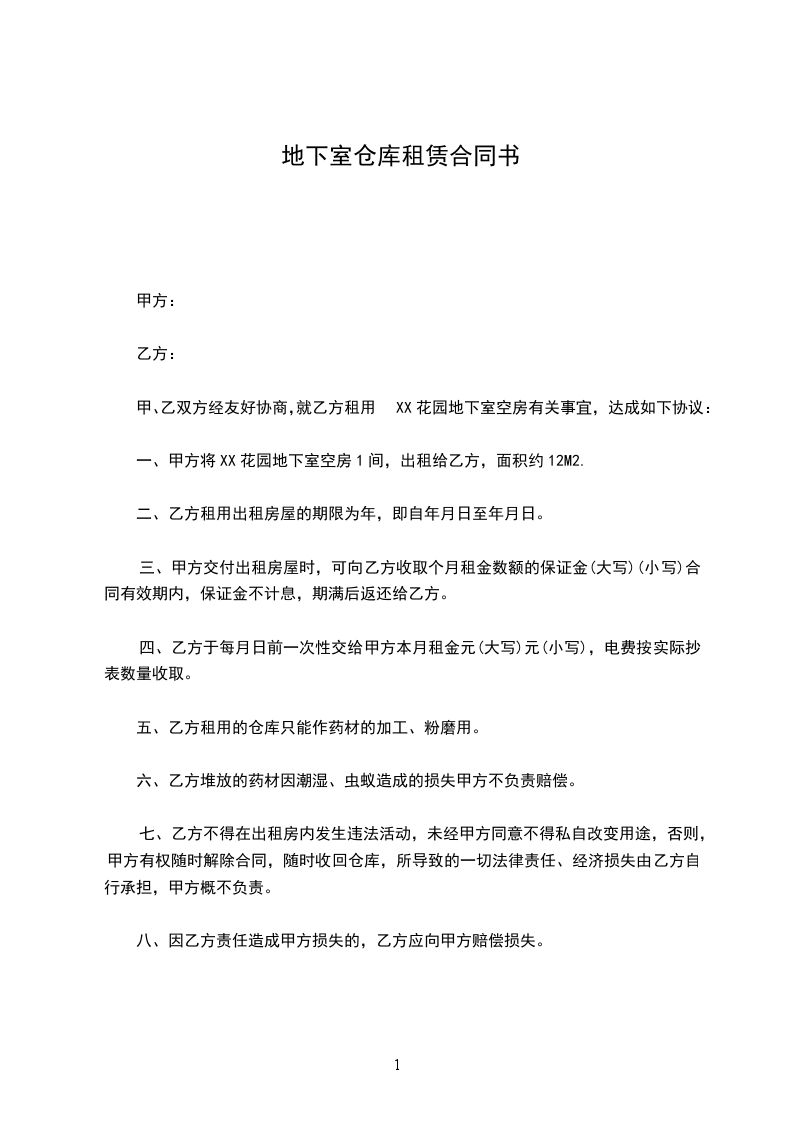 一、甲方将XX花园地下室空房1间,出租给乙方,面积约12M2.