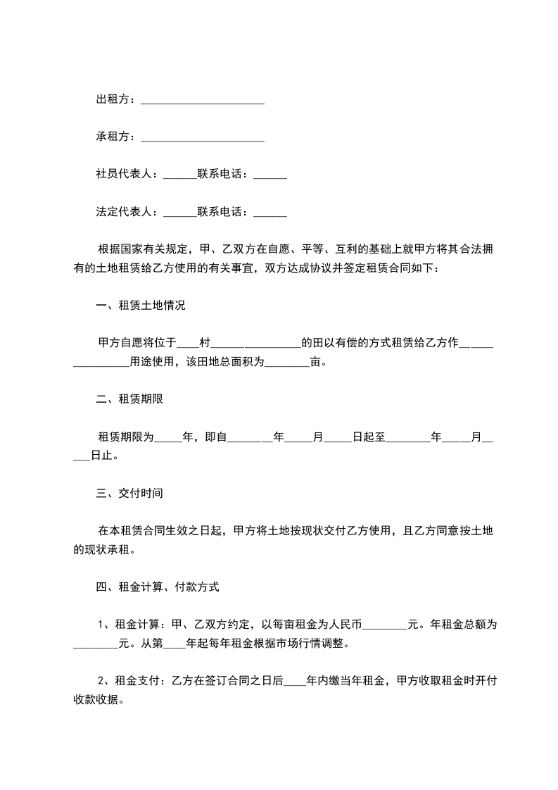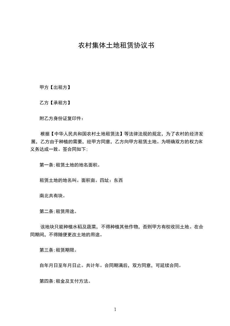 根据【中华人民共和国农村土地租赁法】等法律法规的规定,为了农村的经济发展,乙方由于种植的需要,经甲方同意,乙方向甲方租赁土地。为明确双方的权力和义务达成一致。签合同如下;