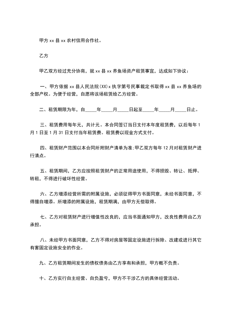 一、甲方依据xx县人民法院(XX)x执字第号民事裁定书取得xx县xx养鱼场的全部产权。为便于经营,自愿将该场租赁给乙方经营。