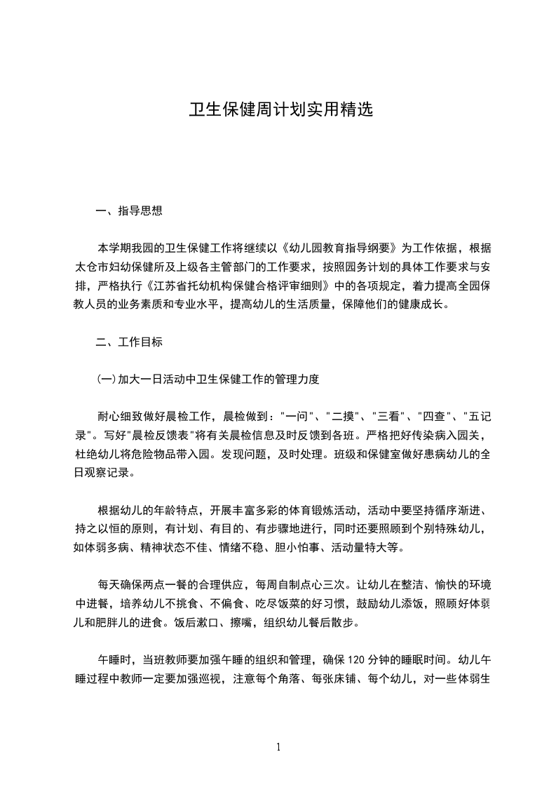 本学期我园的卫生保健工作将继续以《幼儿园教育指导纲要》为工作依据,根据太仓市妇幼保健所及上级各主管部门的工作要求,按照园务计划的具体工作要求与安排,严格执行《江苏省托幼机构保健合格评审细则》中的各项规定,着力提高全园保教人员的业务素质和专业水平,提高幼儿的生活质量,保障他们的健康成长。