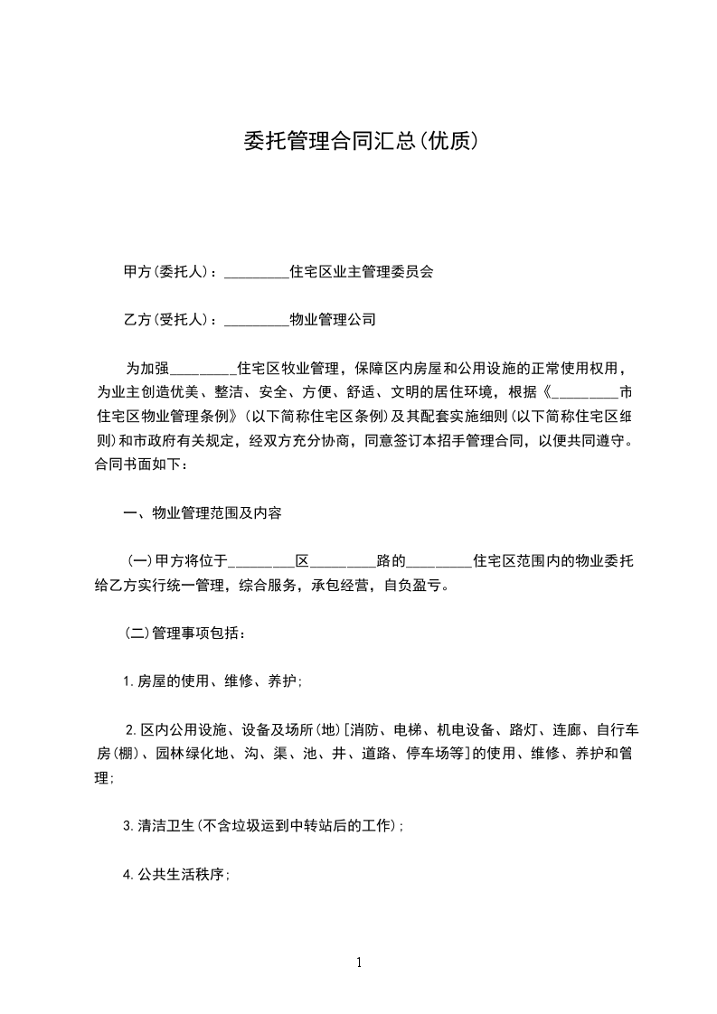 (一)甲方将位于_________区_________路的_________住宅区范围内的物业委托给乙方实行统一管理,综合服务,承包经营,自负盈亏。