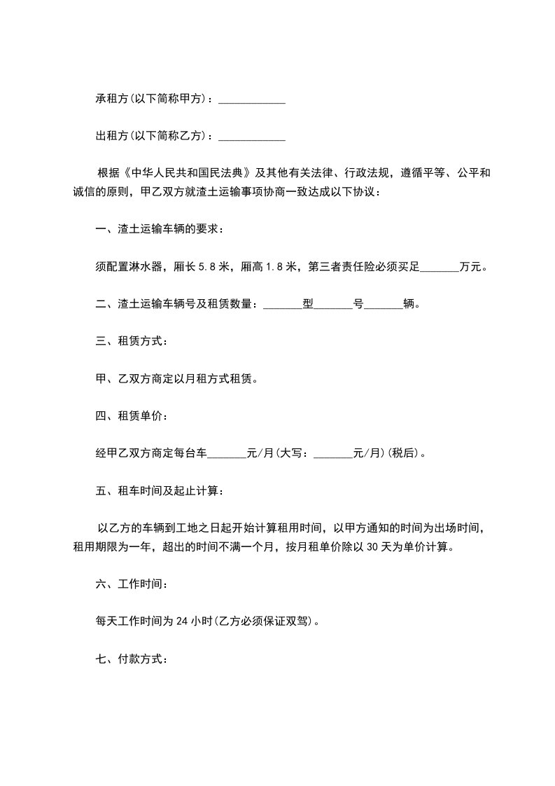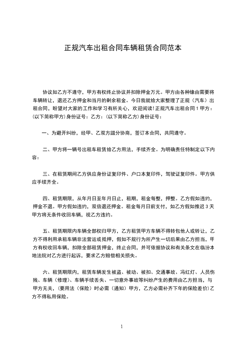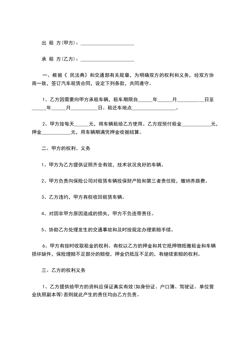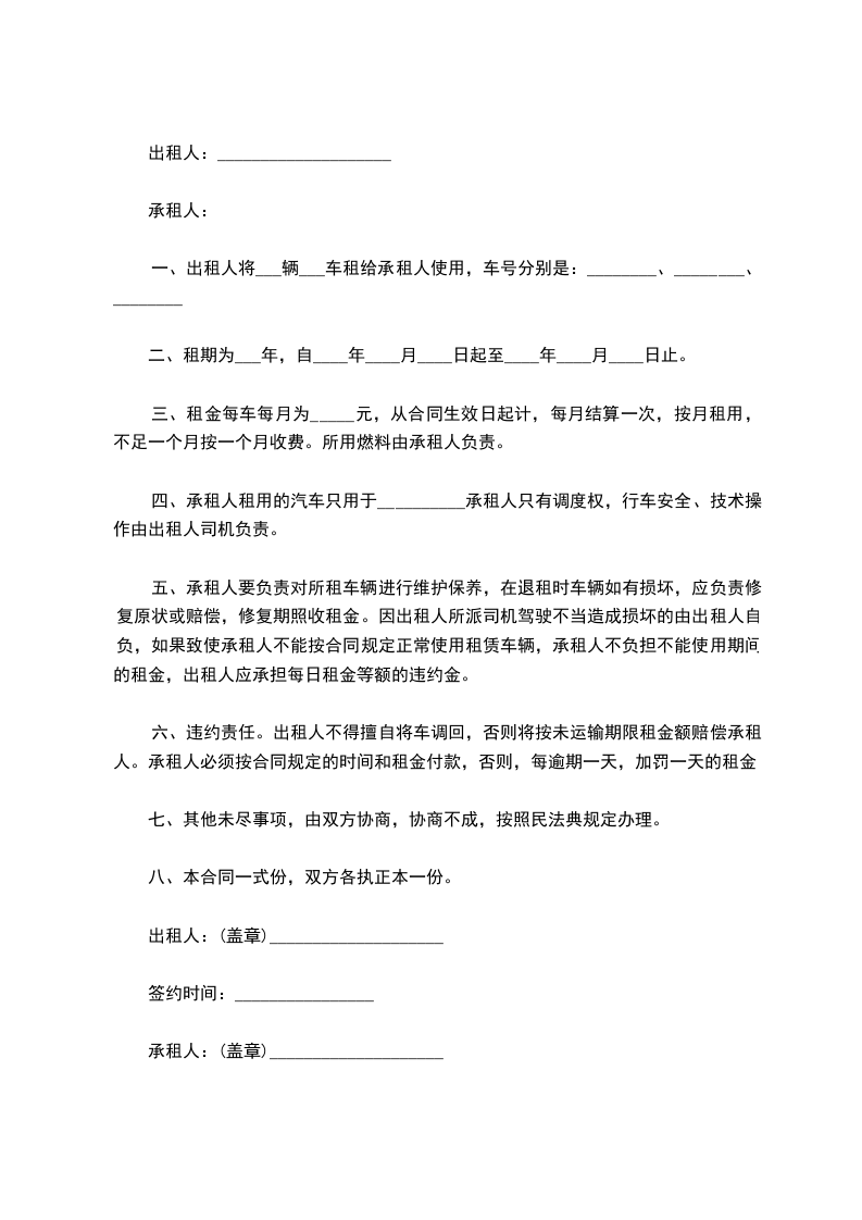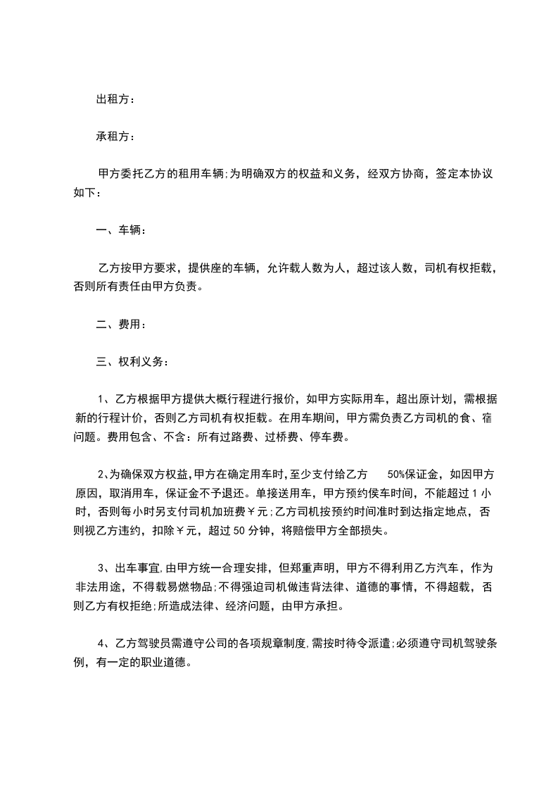一、车辆出租:甲方自愿将其单位车辆(车牌:_____)出租给乙方做使用。甲方应当于本协议订立之日起_____日内向乙方交付车辆,同时还应交付行驶证、购置税缴纳证、已付保险凭证、随车工具、备胎一个。