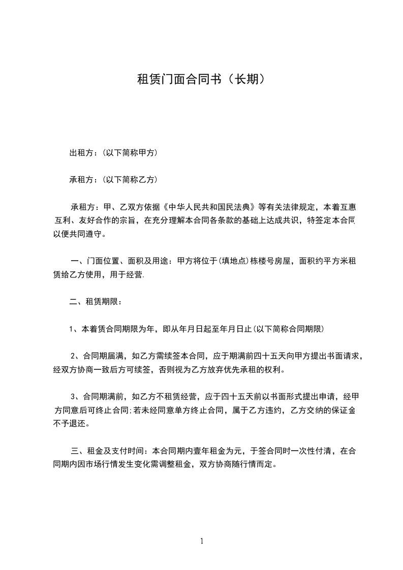 三、租金及支付时间:本合同期内壹年租金为_____元,于签合同时一次性付清,在合同期内因市场行情发生变化需调整租金,双方协商随行情而定。