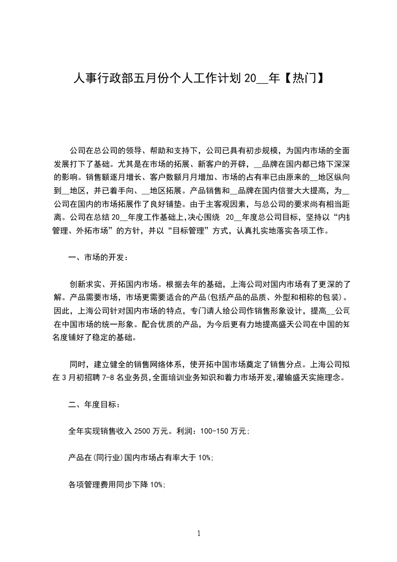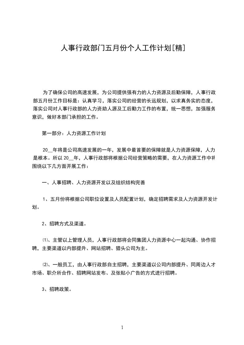 人事行政部门五月份个人工作计划行政人事总务部既行政、人事、总务为一体的综合管理部门。行政管理、人事管理、总务后勤管理是公司有序规范发展中不可缺少的组成部分,成功的企业源于卓越的管理,卓越的管理源于优异、完善的制度,为提高公司的管理水平,凝聚企业团队力量,使企业进入一个管理标准化、规范化的良好状态。