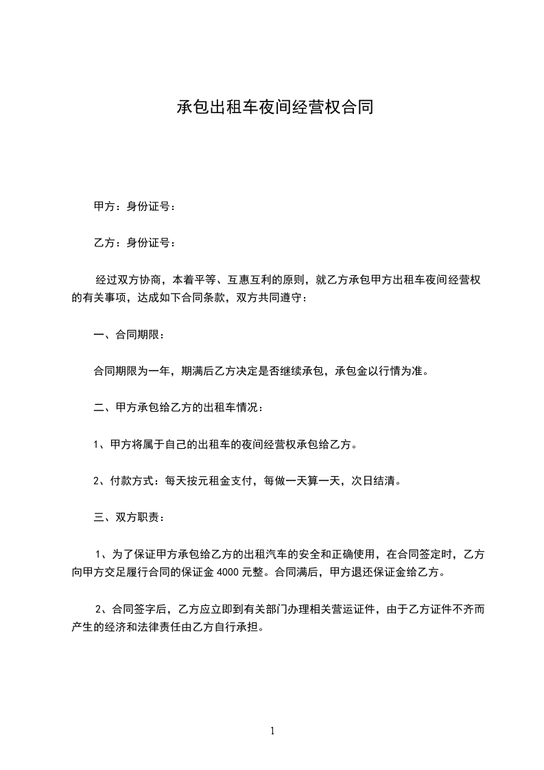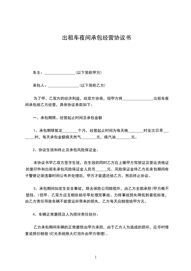 为了甲、乙双方的经济利益,经双方协商,现甲方将东风雪铁龙出租车夜间承包给乙方经营,具体协议条款如下: