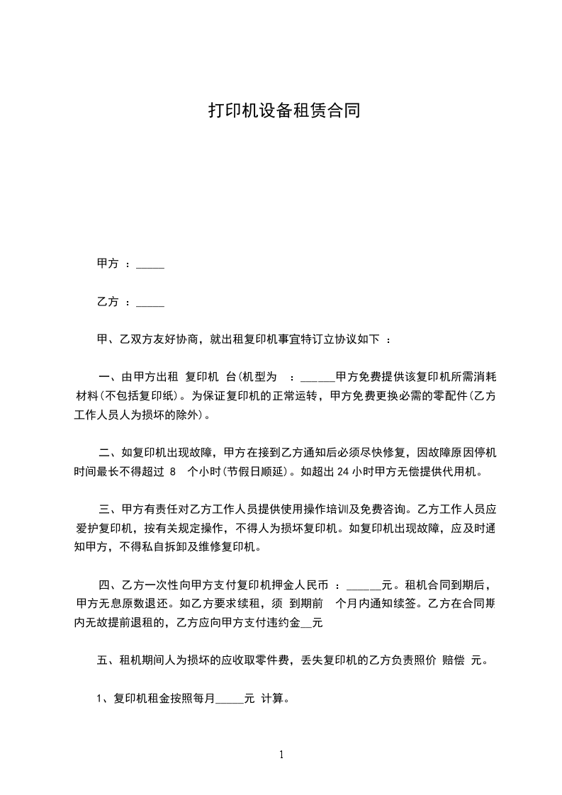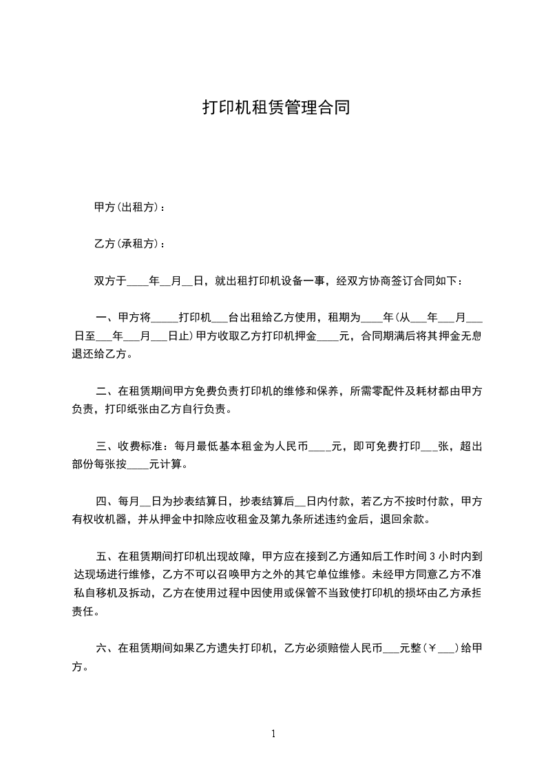 一、甲方将_____打印机___台出租给乙方使用,租期为____年(从___年___月___日至___年___月___日止)甲方收取乙方打印机押金____元,合同期满后将其押金无息退还给乙方。