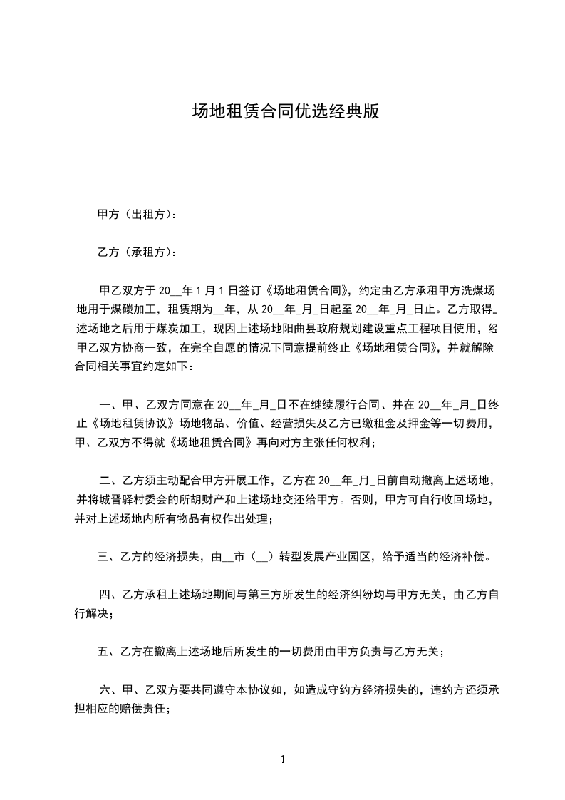 甲乙双方于20__年1月1日签订《场地租赁合同》,约定由乙方承租甲方洗煤场地用于煤碳加工,租赁期为__年,从20__年_月_日起至20__年_月_日止。乙方取得上述场地之后用于煤炭加工,现因上述场地阳曲县政府规划建设重点工程项目使用,经甲乙双方协商一致,在完全自愿的情况下同意提前终止《场地租赁合同》,并就解除合同相关事宜约定如下: