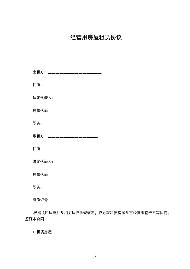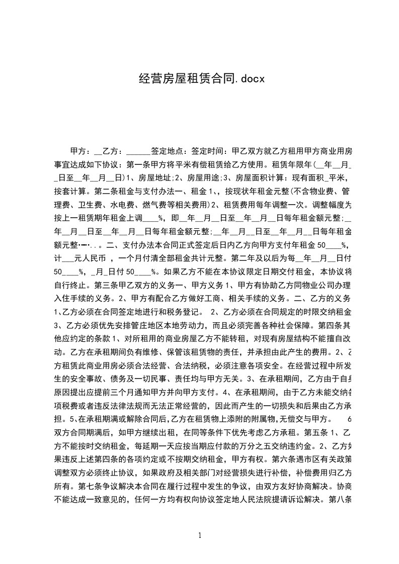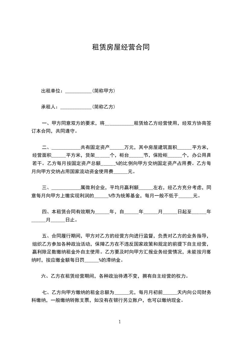 一、甲方同意双方的要求,将____________租赁给乙方经营使用,经双方协商签订本合同,共同遵守。