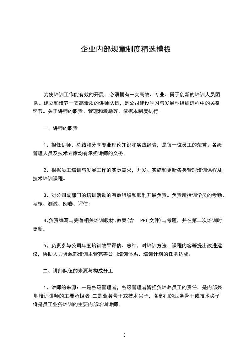 为使培训工作能有效的开展,必须拥有一支高效、专业、勇于创新的培训人员团队。建立和培养一支高素质的讲师队伍,是公司建设学习与发展型组织进程中的关键环节。关于讲师的职责、管理和激励等,依据本制度执行。
