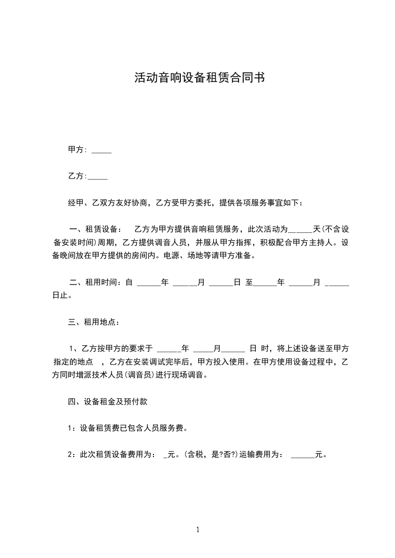 一、租赁设备:_________(如所需设备较多,乙方所列设备清单为合同的有效附件)。电源、场地等请甲方准备。