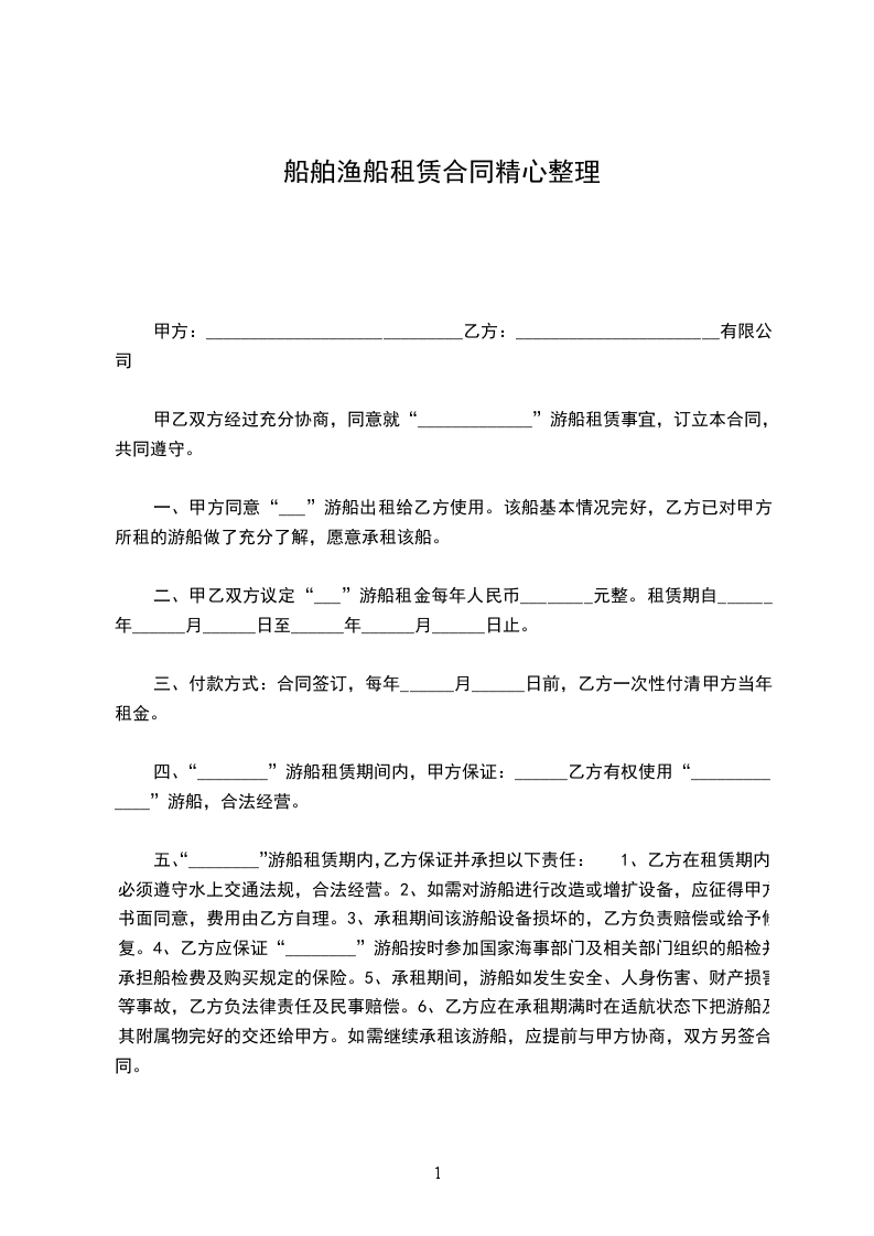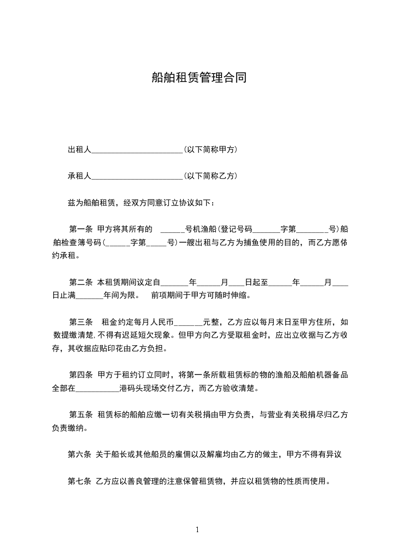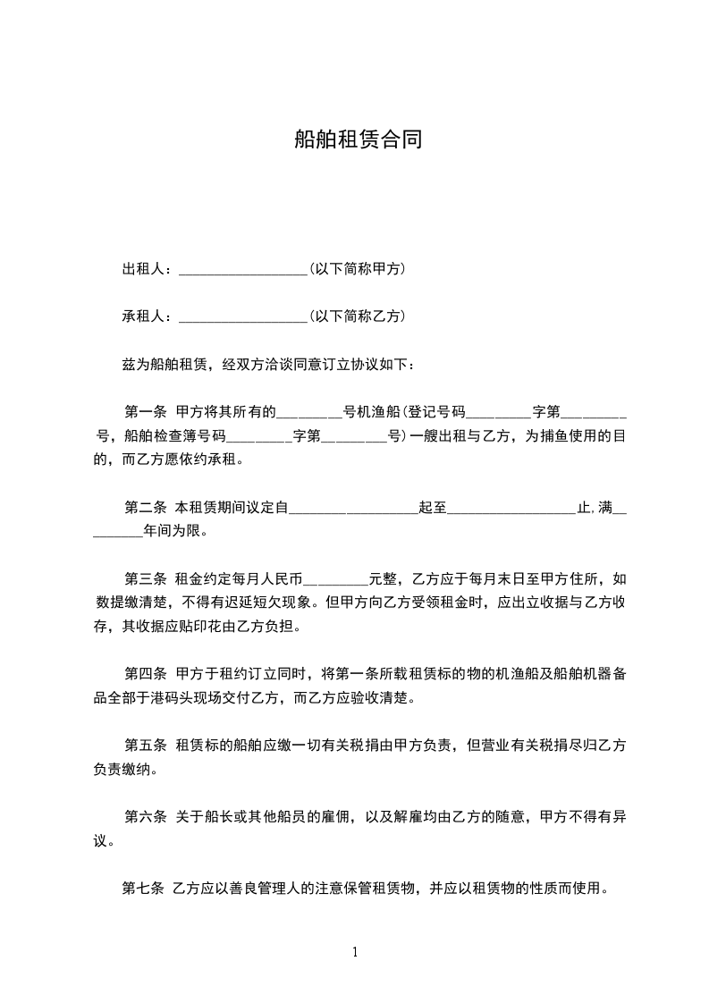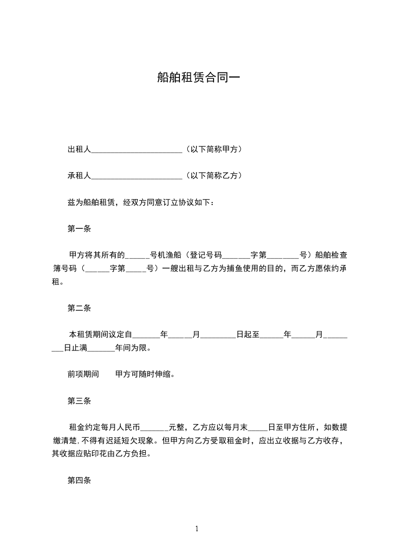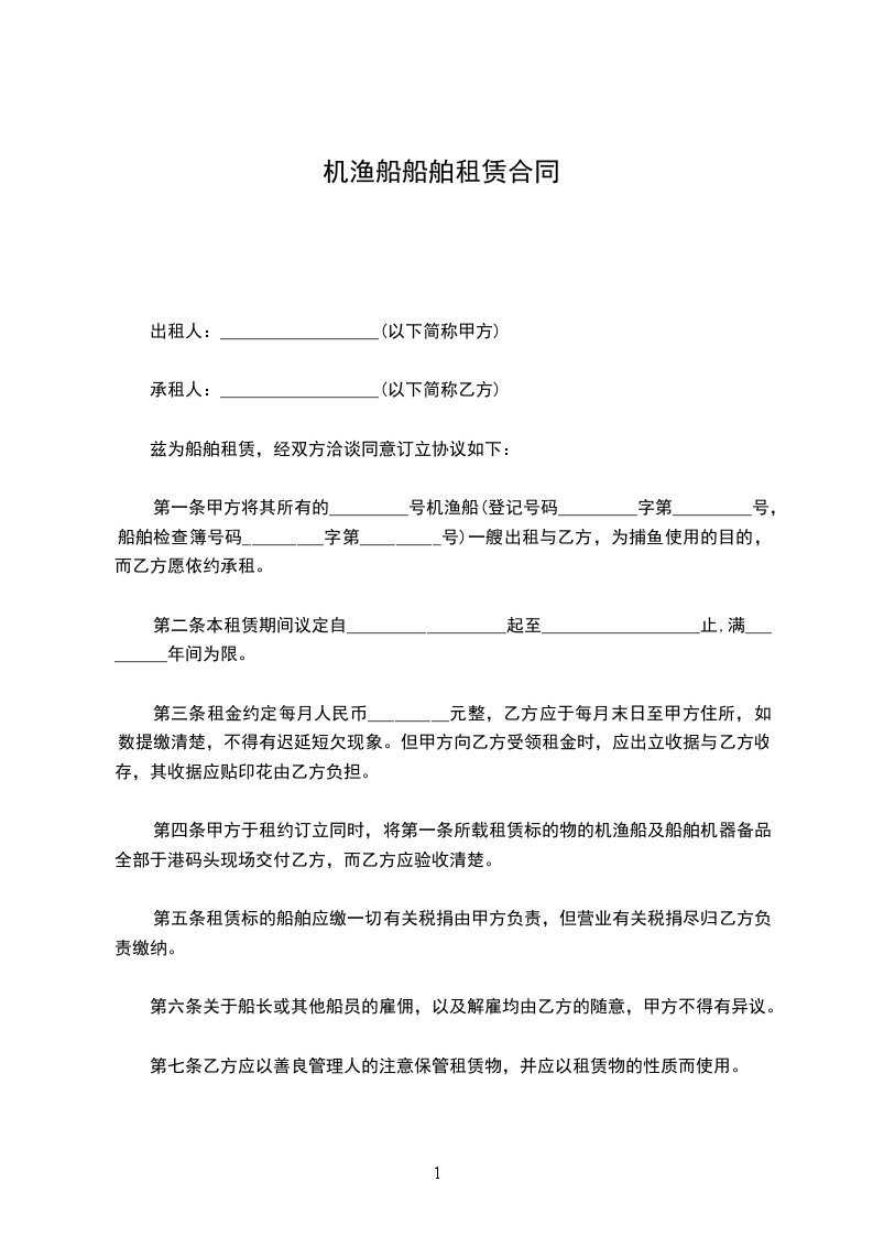 第一条 甲方将其所有的 ______号机渔船(登记号码_______字第________号)船舶检查簿号码(______字第_____号)一艘出租与乙方为捕鱼使用的目的,而乙方愿依约承租。