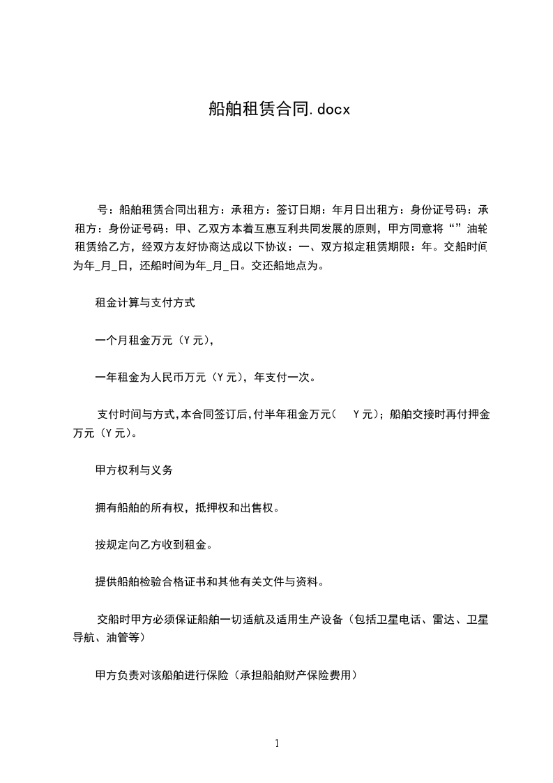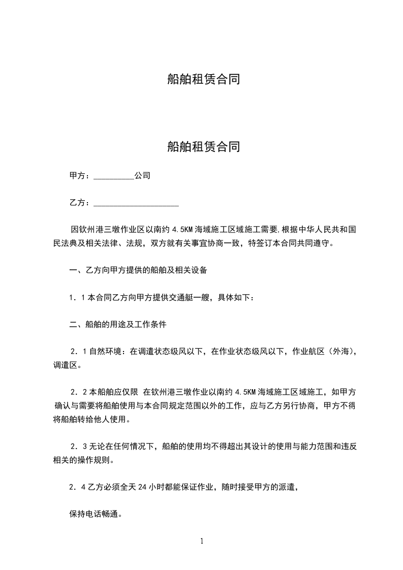 兹为船舶租赁,经双方同意订立协议如下: