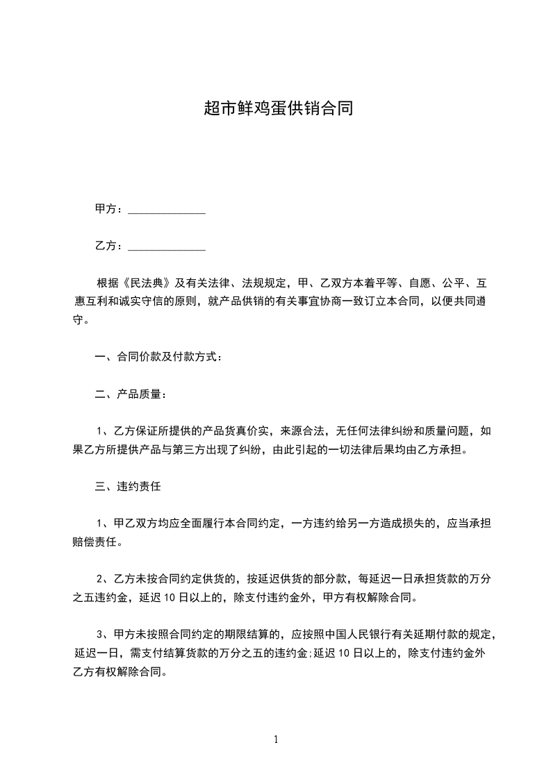 第十条 违约责任:供方违约每欠一斤鲜蛋,应补给需方损失____元。需方违约拒收一斤鲜蛋,则补给供方损失____元。