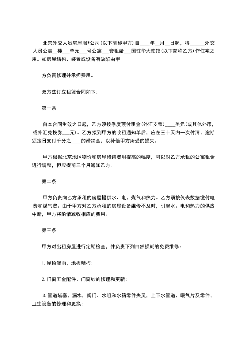 北京外交人员房屋服*公司(以下简称甲方)自____年__月__日起,将______外交人员公寓__楼___单元___号公寓___套租给___国驻华大使馆(以下简称乙方)作住宅之用。如房屋结构、装置或设备有缺陷由甲