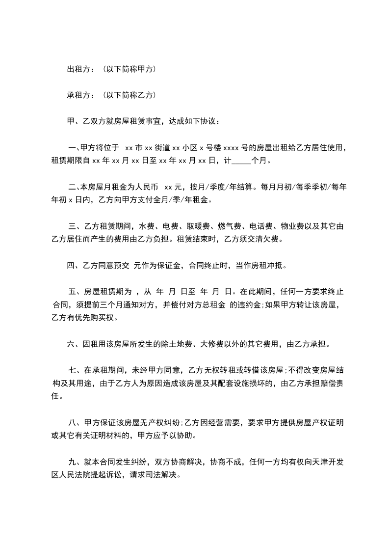 一、甲方将位于xx市xx街道xx小区x号楼xxxx号的房屋出租给乙方居住使用,租赁期限自xx年xx月xx日至xx年xx月xx日,计_____个月。