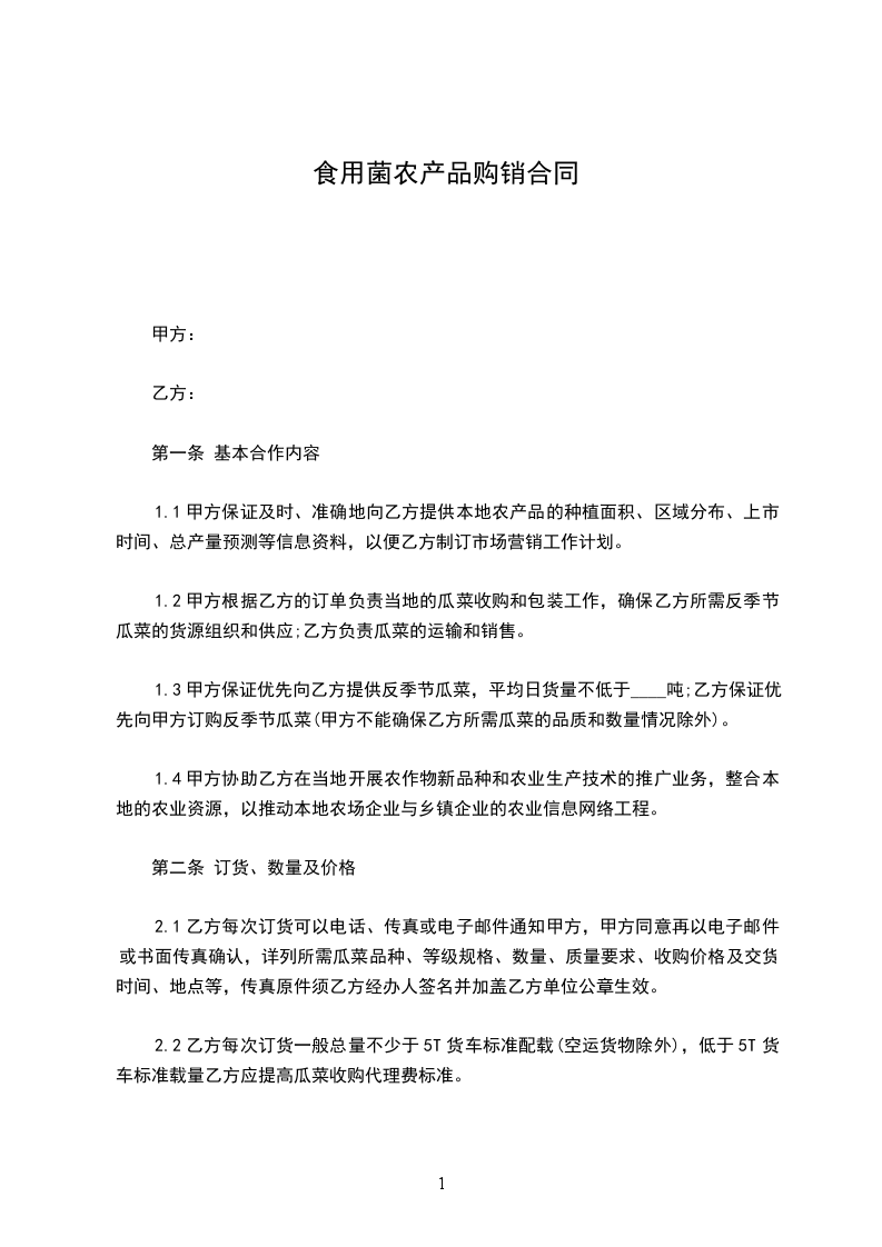 2.1乙方每次订货可以电话、传真或电子邮件通知甲方,甲方同意再以电子邮件或书面传真确认,详列所需瓜菜品种、等级规格、数量、质量要求、收购价格及交货时间、地点等,传真原件须乙方经办人签名并加盖乙方单位公章生效。
