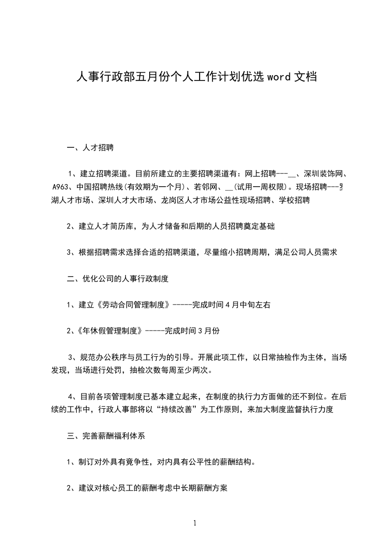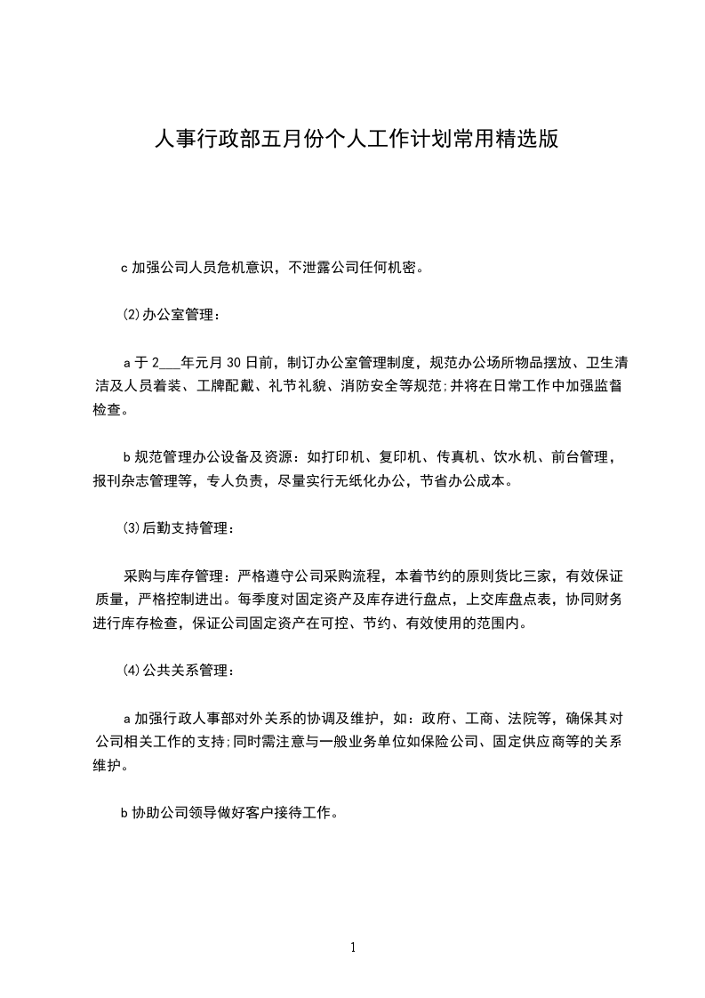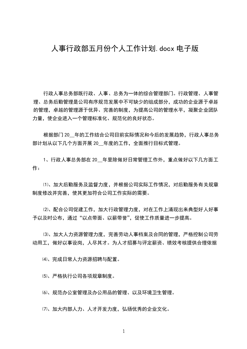 根据部门20__年的工作结合公司目前实际情况和今后的发展趋势,行政人事总务部计划从以下几个方面开展20__年度的工作,全面推行目标式管理。