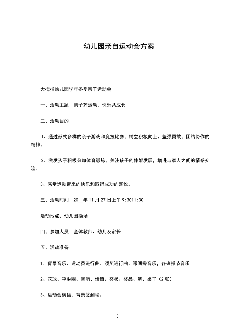 园内大环境:在操场区域悬挂“_幼儿园运动会”条幅,并在操场周围悬挂彩色小旗或气球,以营造运动会氛围。根据比赛需要划分出跑道、投掷区、跳远区以及其他赛区、休息、看台等区域,并做出相应区域指示说明牌,确保比赛幼儿以及观看幼儿安全。