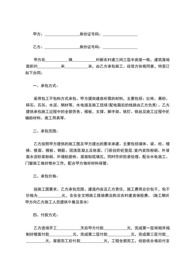 甲方在____________镇____________村新农村建三间三层半房屋一栋,建筑落地面积约____________米____________米,由乙方承包施工。经双方协商同意,特签订如下合同: