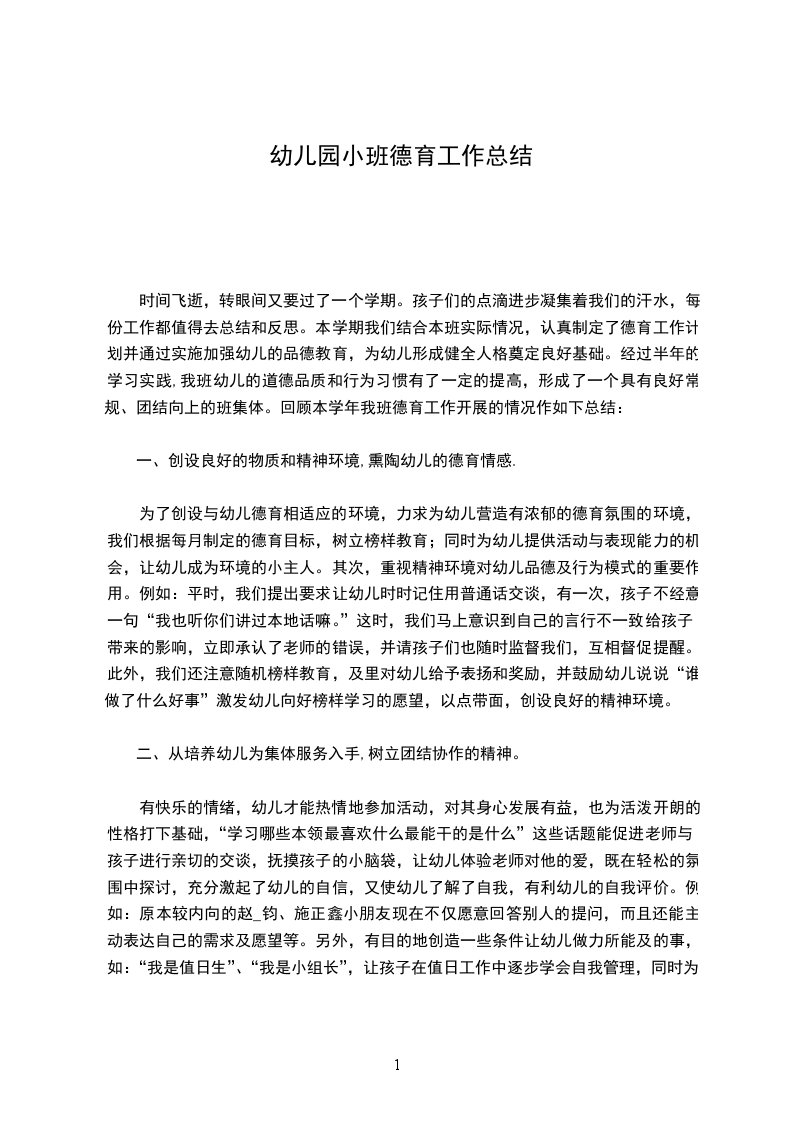 幼儿园小班德育工作计划通用一、指导思想
