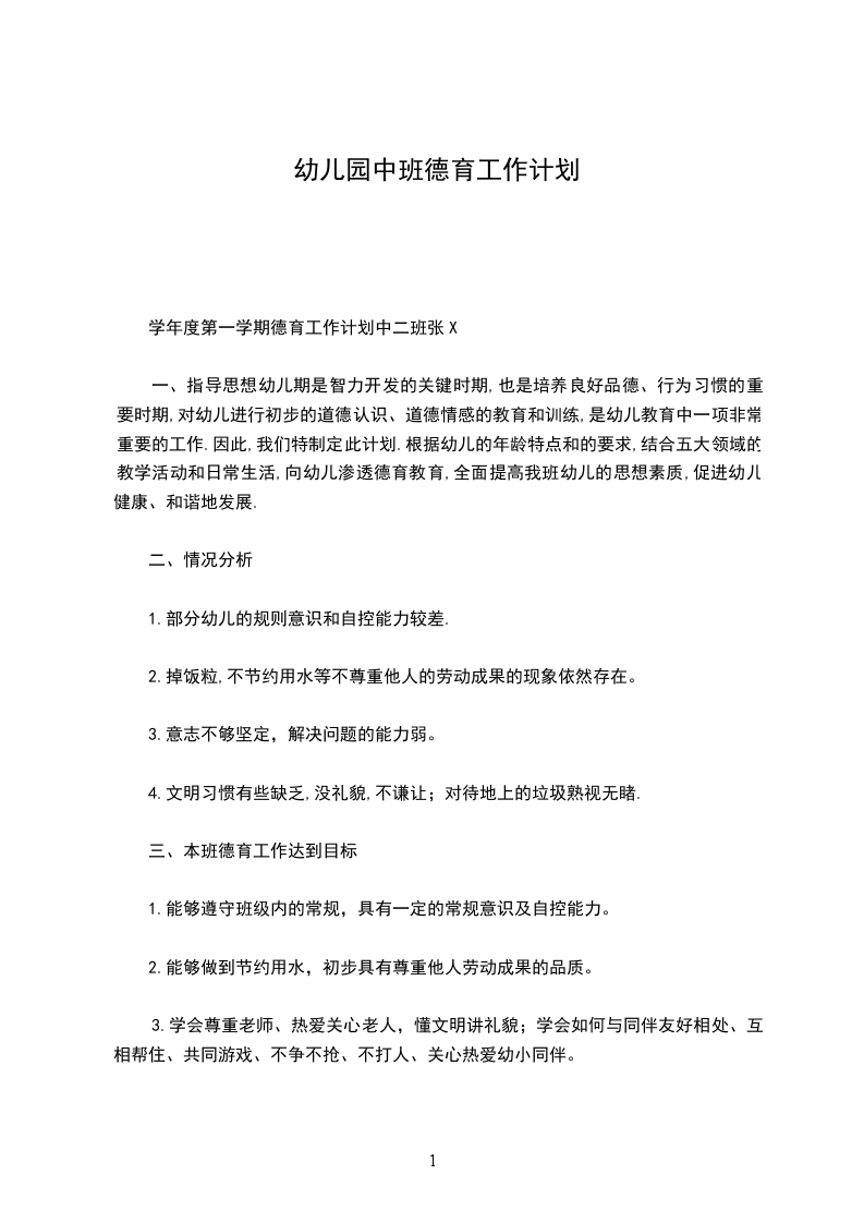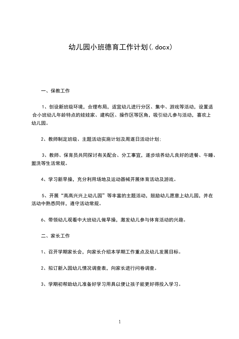 幼儿园小班德育工作计划通用一、工作目标