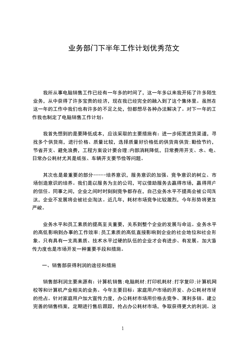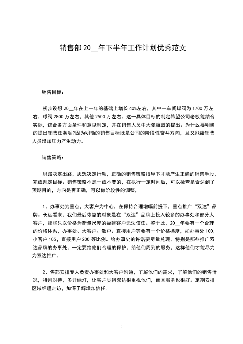销售部20__下半年工作计划作为销售部经理的自己为了更好地带领好销售团队取得更好的业绩,我在以往的销售部管理工作中付出了很多的心血,尽管说我手底下的员工在工作中从未让满怀期待的自己失望过,但是本着“人无远虑必有近忧”的想法还是为了以后的工作做一些简单的规划与准备比较好,至少从接下来的下半年工作我便能够看出目前的形式是不容忽视的,所以我打算为自己对销售部的管理工作制定一份下半年的工作计划。