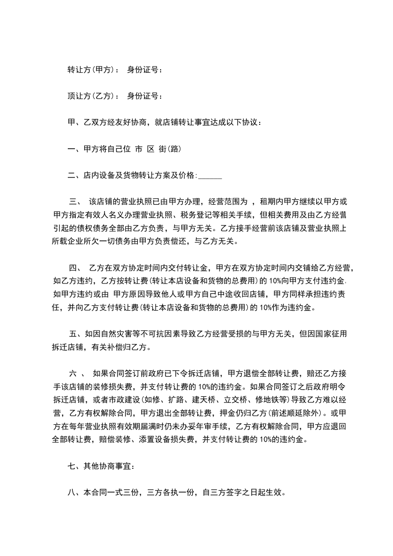 (1)甲方保证该门面有合法承租权并有权依法转让,应按合同规定的时间交付门面,逾期一天按照______元的标准向乙方支付违约金,超过______天乙方有权解除合同;