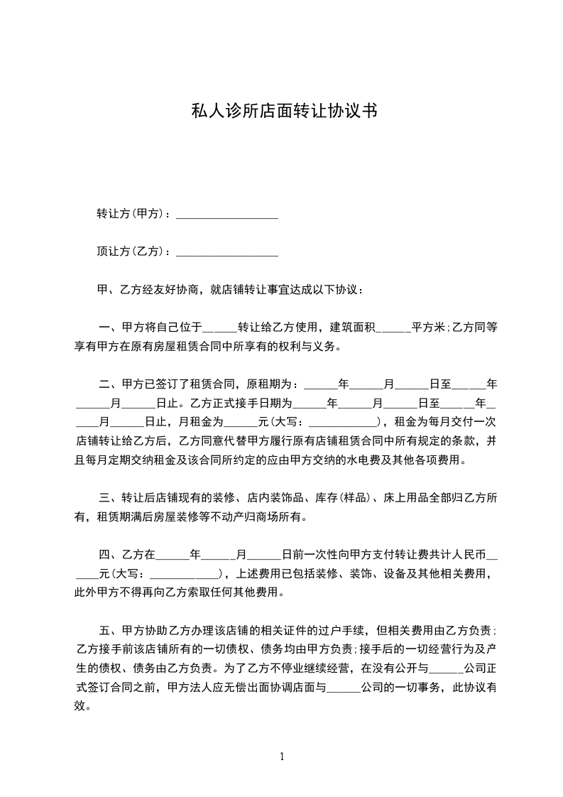 甲、乙方经友好协商,就店铺转让事宜达成以下协议: