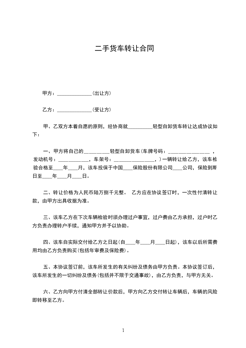甲、乙双方本着自愿的原则,经协商就__________轻型自卸货车转让达成协议如下: