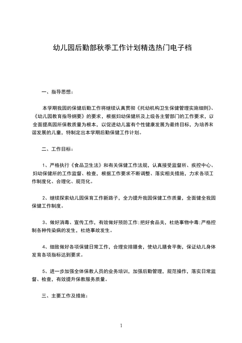 本学期我园的保健后勤工作将继续认真贯彻《托幼机构卫生保健管理实施细则》、《幼儿园教育指导纲要》的要求,根据妇幼保健所及上级各主管部门的工作要求,以全面提高园所保教质量为根本,以促进幼儿富有个性健康发展为最终目标,为培养和谐发展的儿童,特制定出本学期后勤保健工作计划。