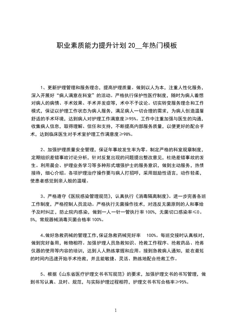 6、加强护理人员的在职培训力度,不断提高业务技术水平。护理人员三基水平平均≥75分;护理技术操作合格率≥95%;支持护理人员参加继续教育学习和培训,继续教育学分每人每年≥25分。鼓励护理人员参加自学、函授及各种学习班、研讨会,使护理人员及时掌握护理工作发展的新动态和护理相关的新理论、新技术,不断提高护理人员的业务水平,更好的配合手术科室开展新业务、新技术。鼓励广大护理人员积极撰写论文,争取全科在市级以上刊物发表或交流论文≥4按照护理培训计划安排人员外出进修学习,提高专科护理水平,以此带动全科人员的技术水平。