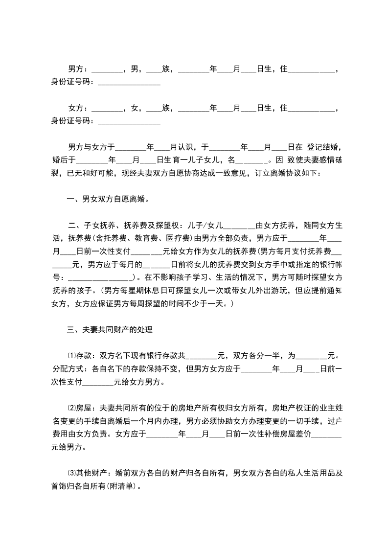 男方与女方于________年____月认识,于________年____月____日在 登记结婚,婚后于________年____月____日生育一儿子女儿,名________。因 致使夫妻感情破裂,已无和好可能,现经夫妻双方自愿协商达成一致意见,订立离婚协议如下: