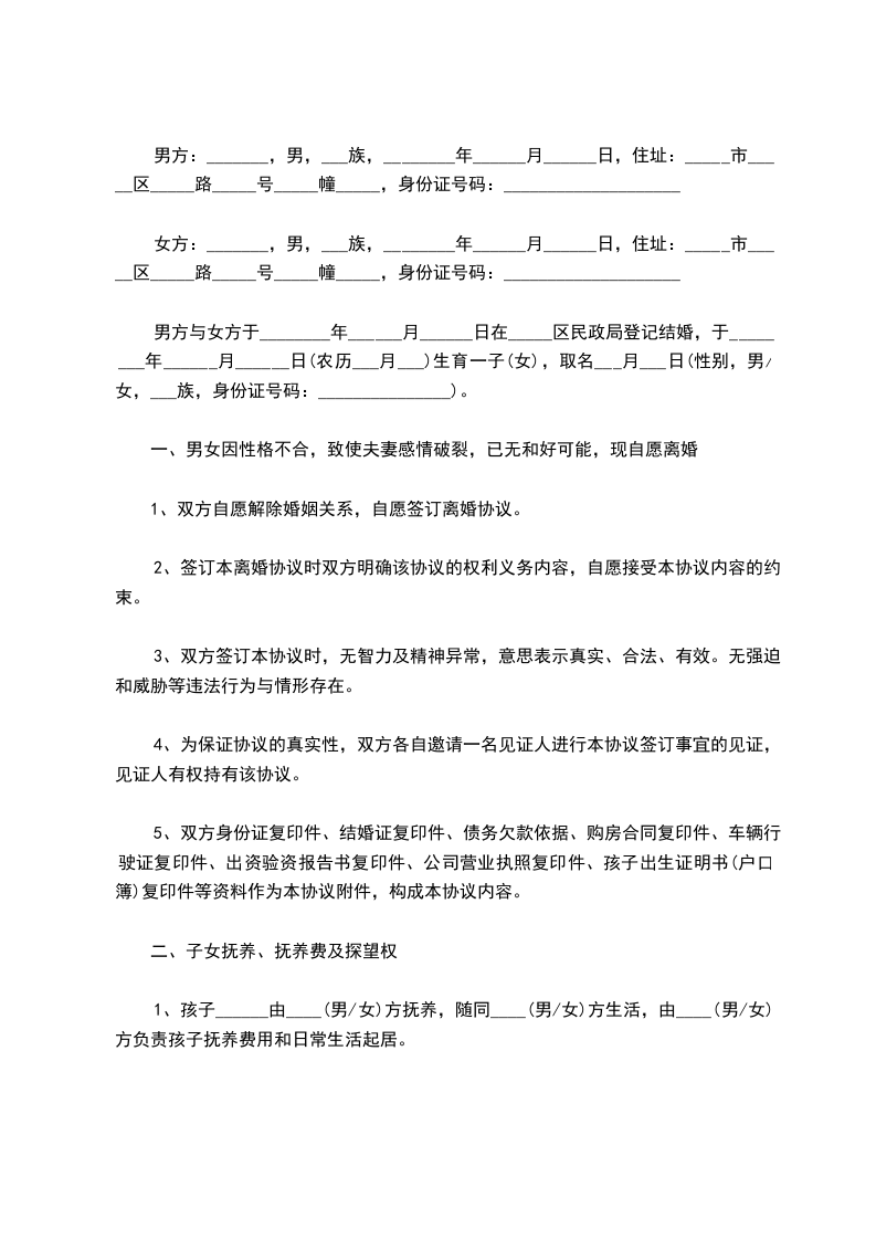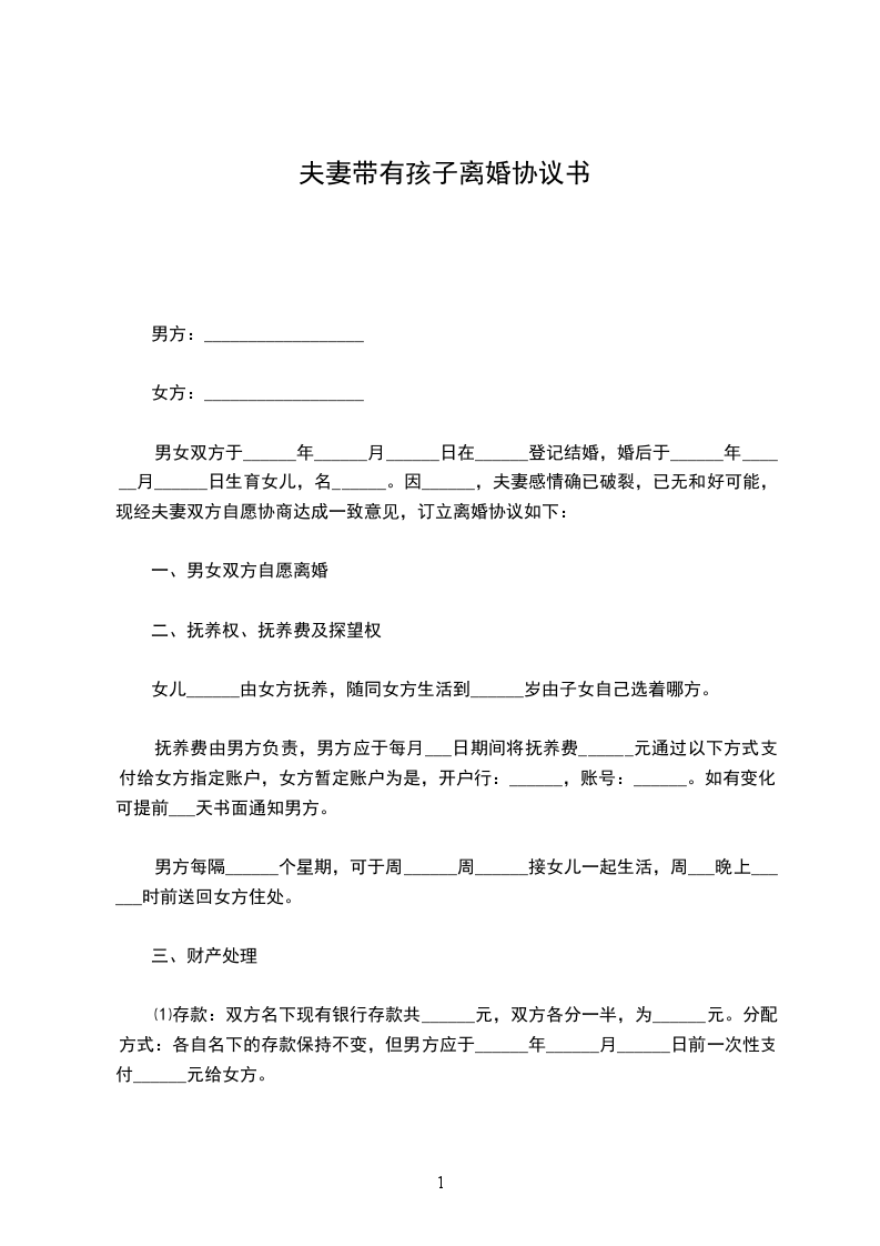 男女双方于______年______月______日在______登记结婚,婚后于______年______月______日生育女儿,名______。因______,夫妻感情确已破裂,已无和好可能,现经夫妻双方自愿协商达成一致意见,订立离婚协议如下: