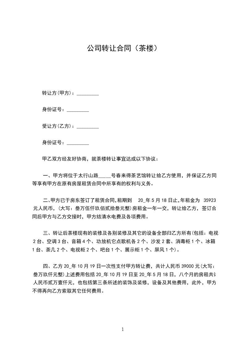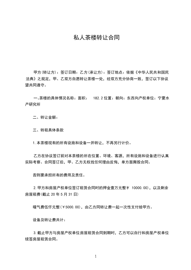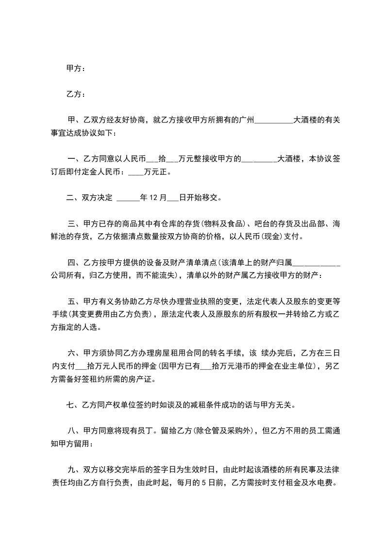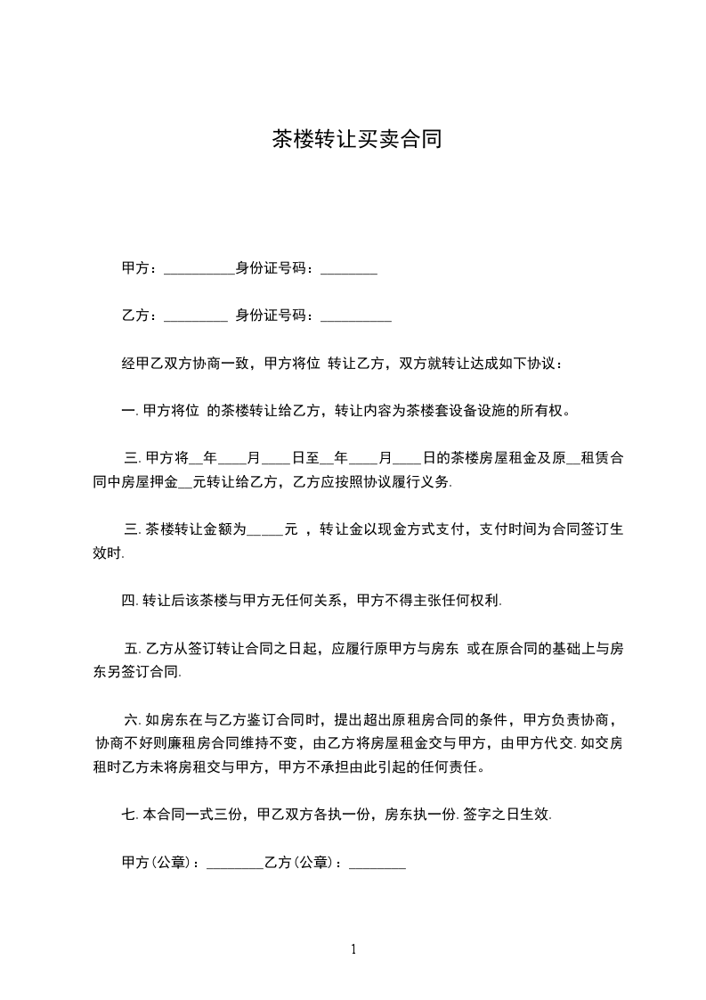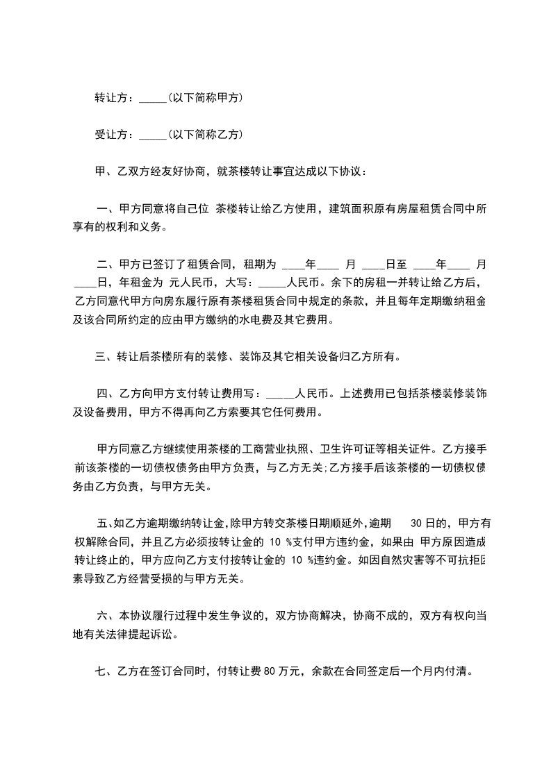 甲乙双方经友好协商,就茶楼转让事宜达成以下协议:
