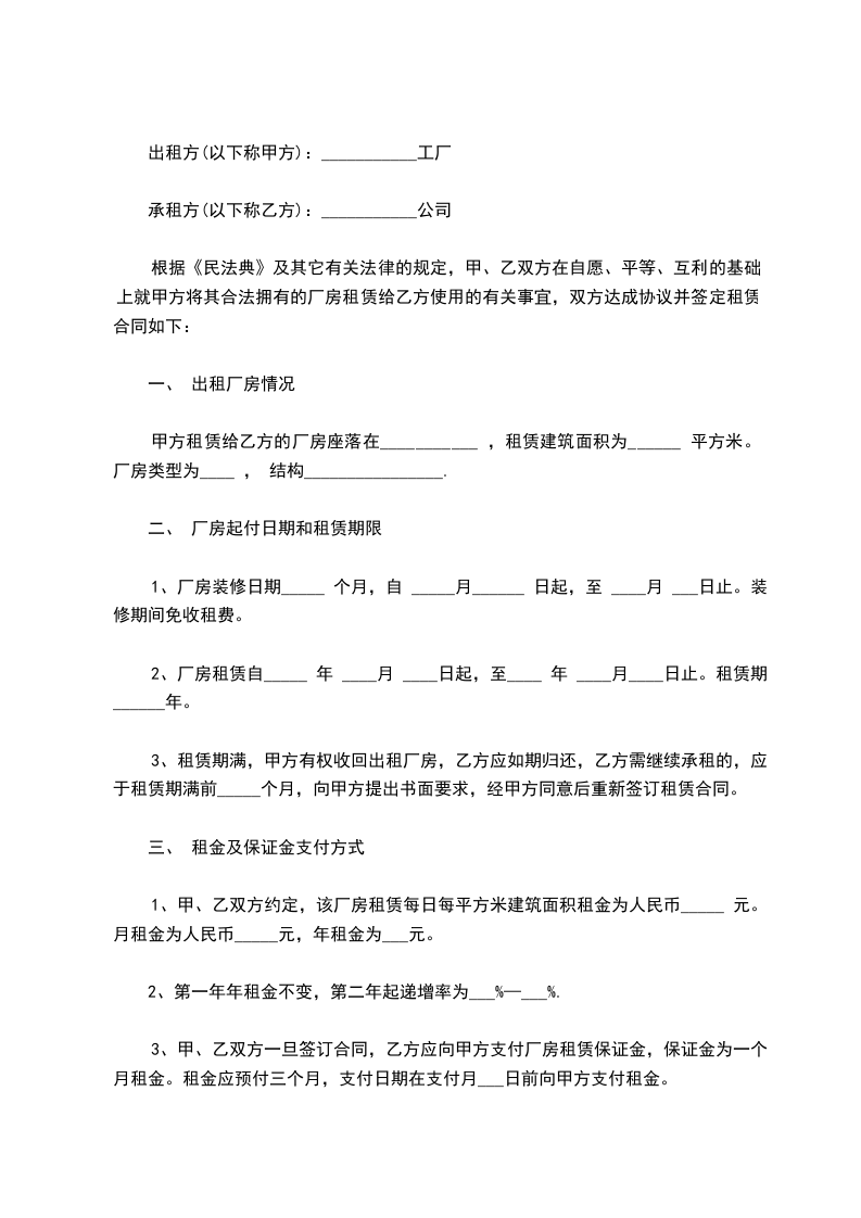 根据《民法典》及其它有关法律的规定,甲、乙双方在自愿、平等、互利的基础上就甲方将其合法拥有的厂房租赁给乙方使用的有关事宜,双方达成协议并签定租赁合同如下: