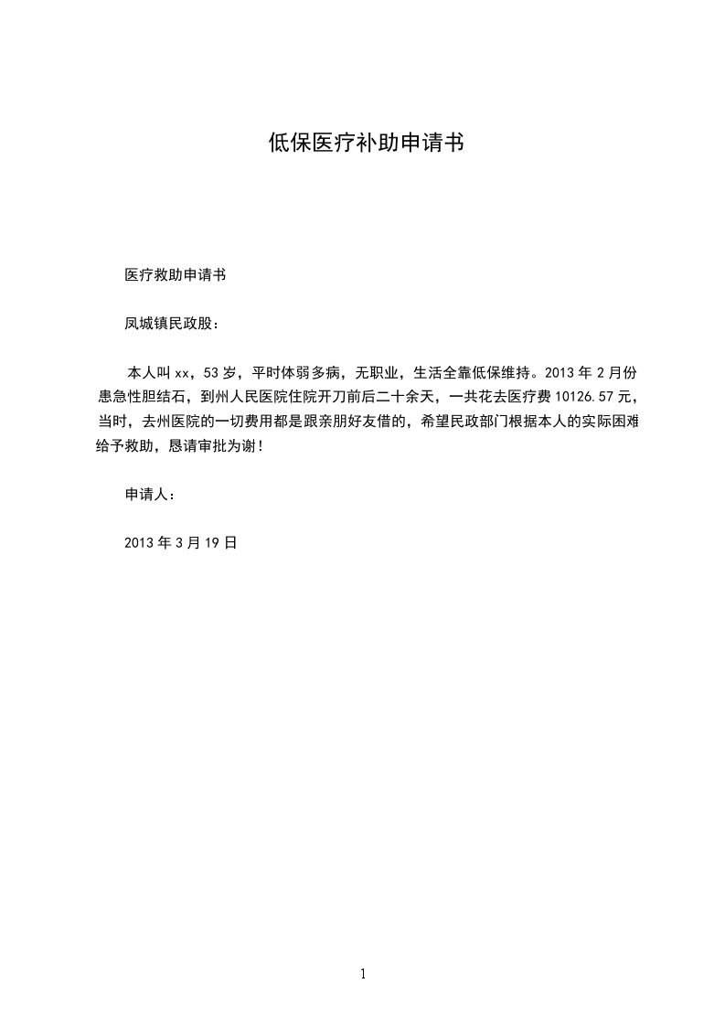 本人叫xx,53岁,平时体弱多病,无职业,生活全靠低保维持。2024年2月份患急性胆结石,到州人民医院住院开刀前后二十余天,一共花去医疗费10126.57元,当时,去州医院的一切费用都是跟亲朋好友借的,希望民政部门根据本人的实际困难给予救助,恳请审批为谢!