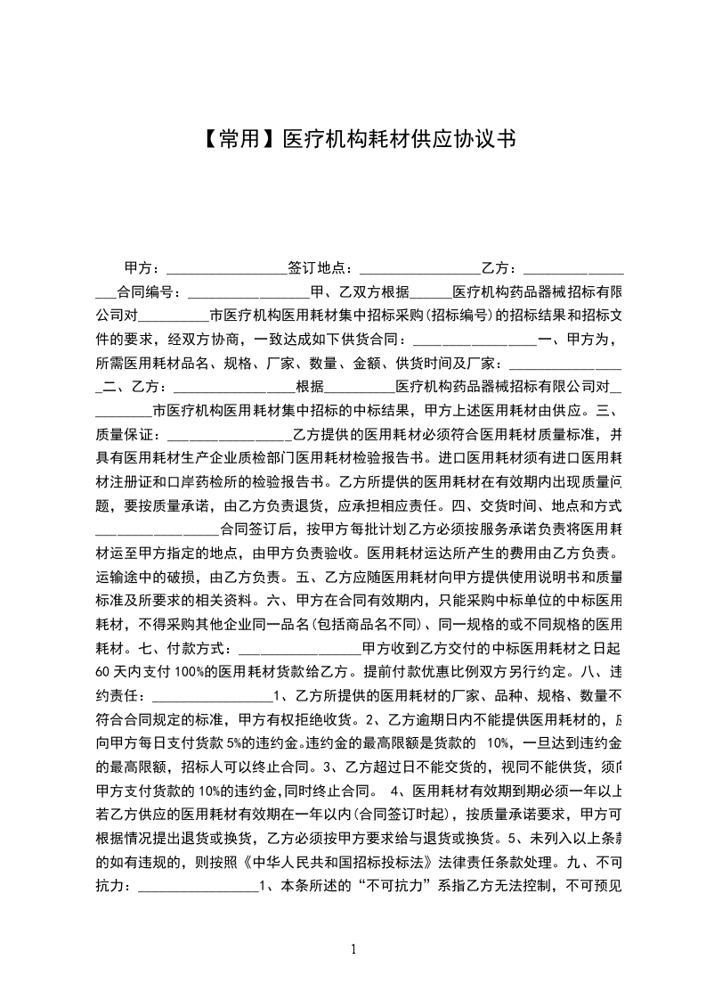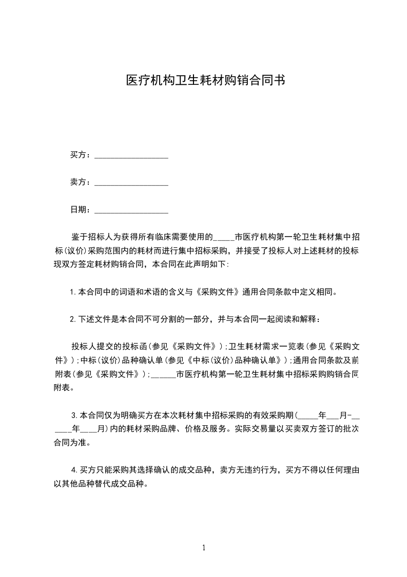鉴于招标人为获得所有临床需要使用的_____市医疗机构第一轮卫生耗材集中招标(议价)采购范围内的耗材而进行集中招标采购,并接受了投标人对上述耗材的投标。现双方签定耗材购销合同,本合同在此声明如下: