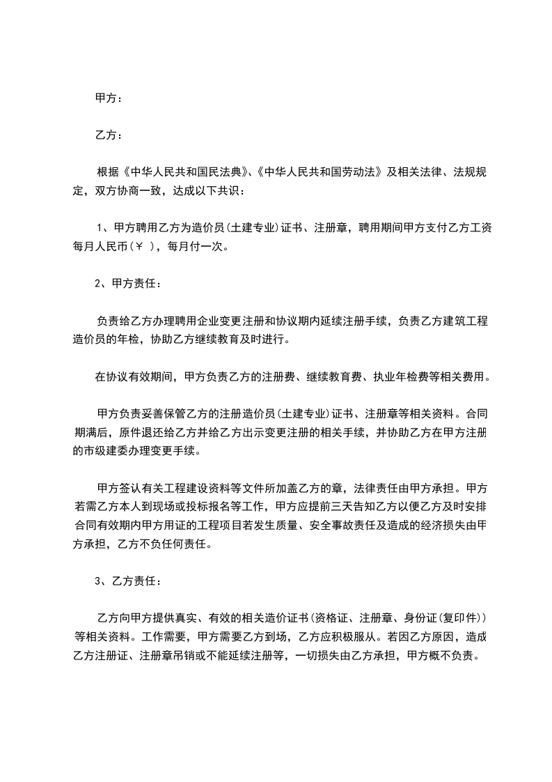 1、甲方聘用乙方为造价员(土建专业)证书、注册章,聘用期间甲方支付乙方工资每月人民币(¥ ),每月付一次。