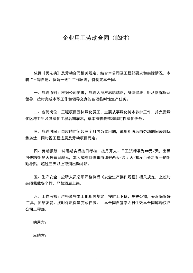 依据《民法典》及劳动合同相关规定,结合本公司及工程部要求和实际情况,本着“平等自愿、协调一致”工作原则,特制定本合同。