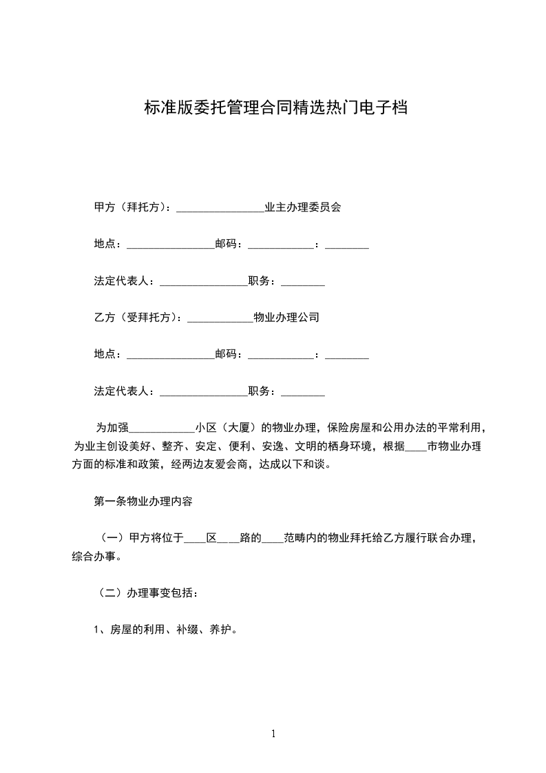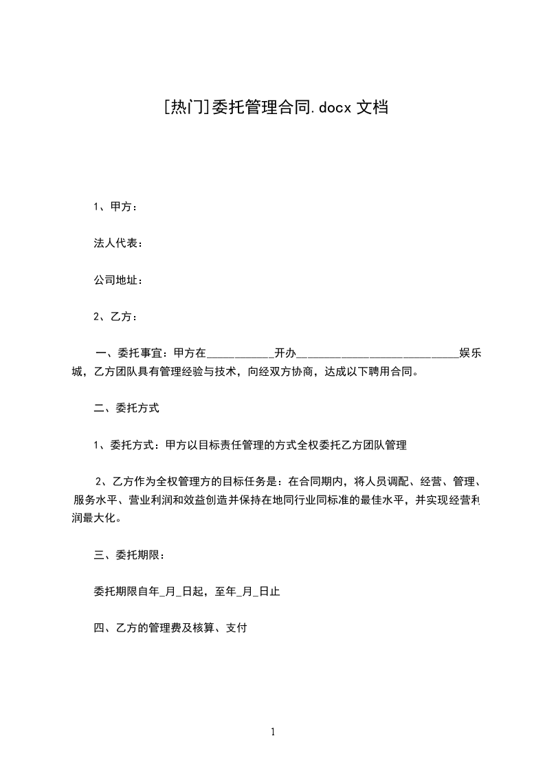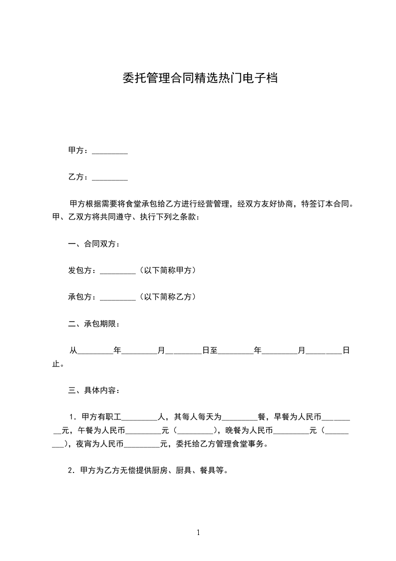 1.甲方有职工_________人,其每人每天为_________餐,早餐为人民币_________元,午餐为人民币_________元(_________),晚餐为人民币_________元(_________),夜宵为人民币_________元,委托给乙方管理食堂事务。