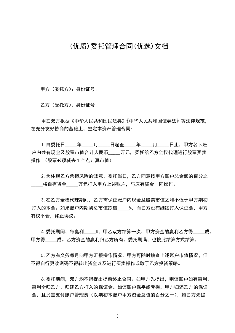 1.自委托日_____年_____月_____日起至_____年_____月_____日止,甲方名下账户内共有现金及股票市值合计人民币_____万元,委托给乙方全权代理进行股票买卖操作。(股票必须减去1个点计算市值)
