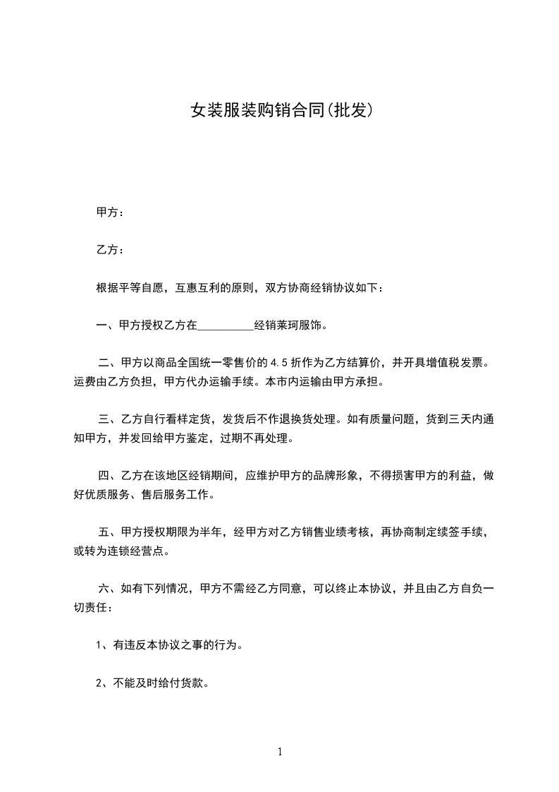三、乙方自行看样定货,发货后不作退换货处理。如有质量问题,货到三天内通知甲方,并发回给甲方鉴定,过期不再处理。