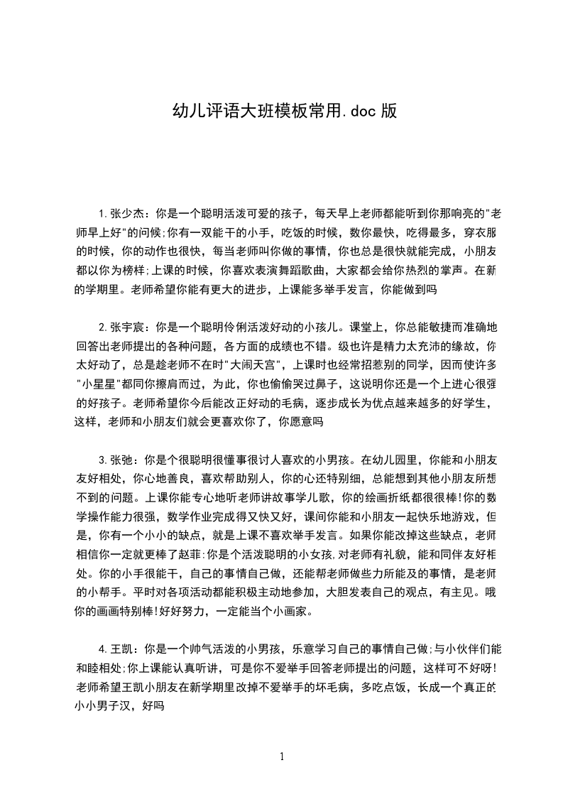 1.张雾雨:你是一个活泼、好动的孩子。你对老师有礼貌,积极参加体育锻炼,自己的事情自己做,不依赖别人,你上课有时能举手发言,但你有时不能遵守纪律,需要老师不断督促、提醒。希望你以后能加强自我约束,做个爱学习、守纪律的孩子。