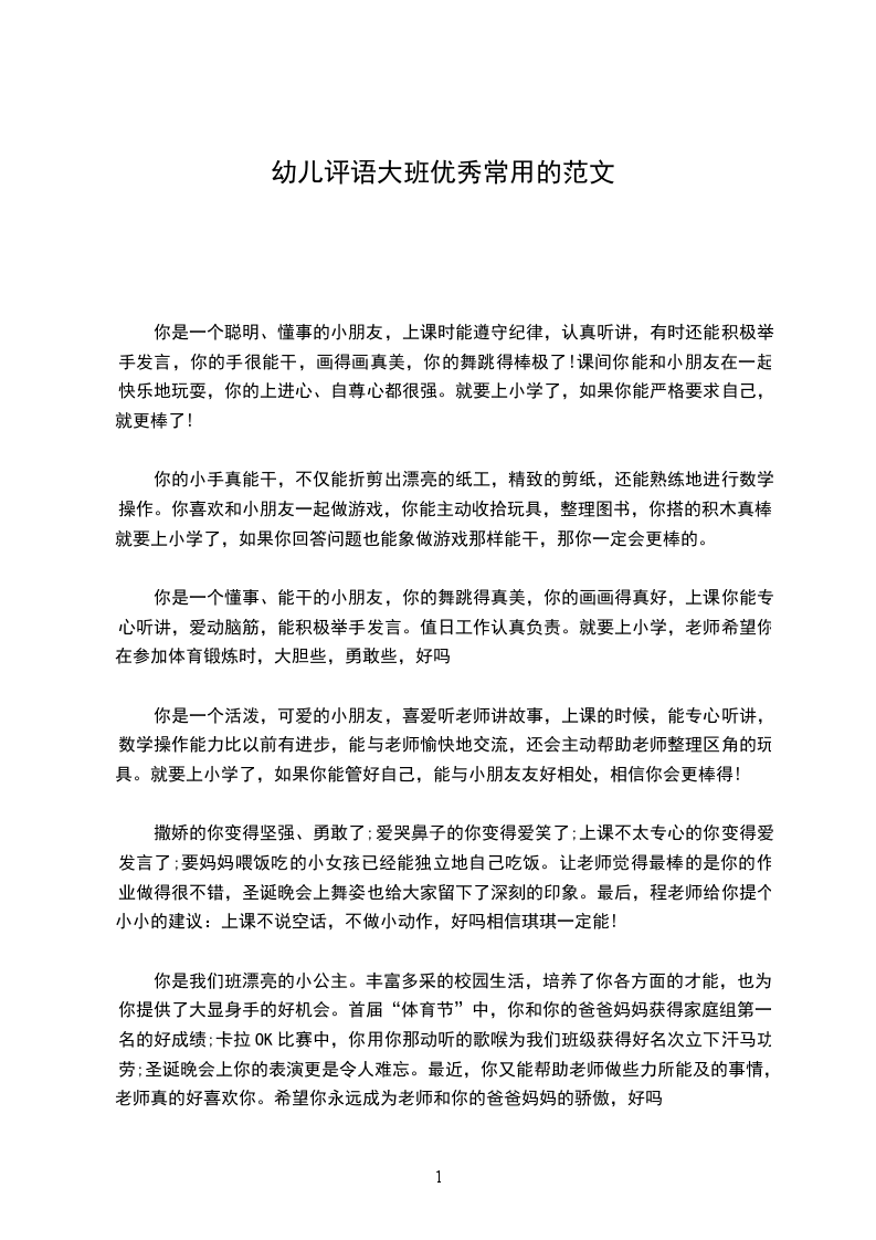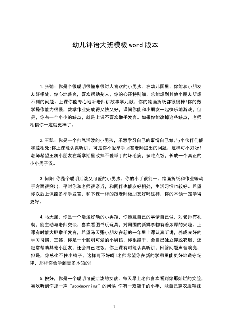10.王小妍:其实你很聪明,你为大家讲的孙悟空的故事真好听。你也很能干,你能把小椅子排得整整齐齐。你与同伴能友好相处,能尊敬老师,但是你上课时有时不能集中注意力听老师上课,身体也很弱。希望小妍小朋友以后能加强身体锻炼,上课也能积极举手发言,好吗